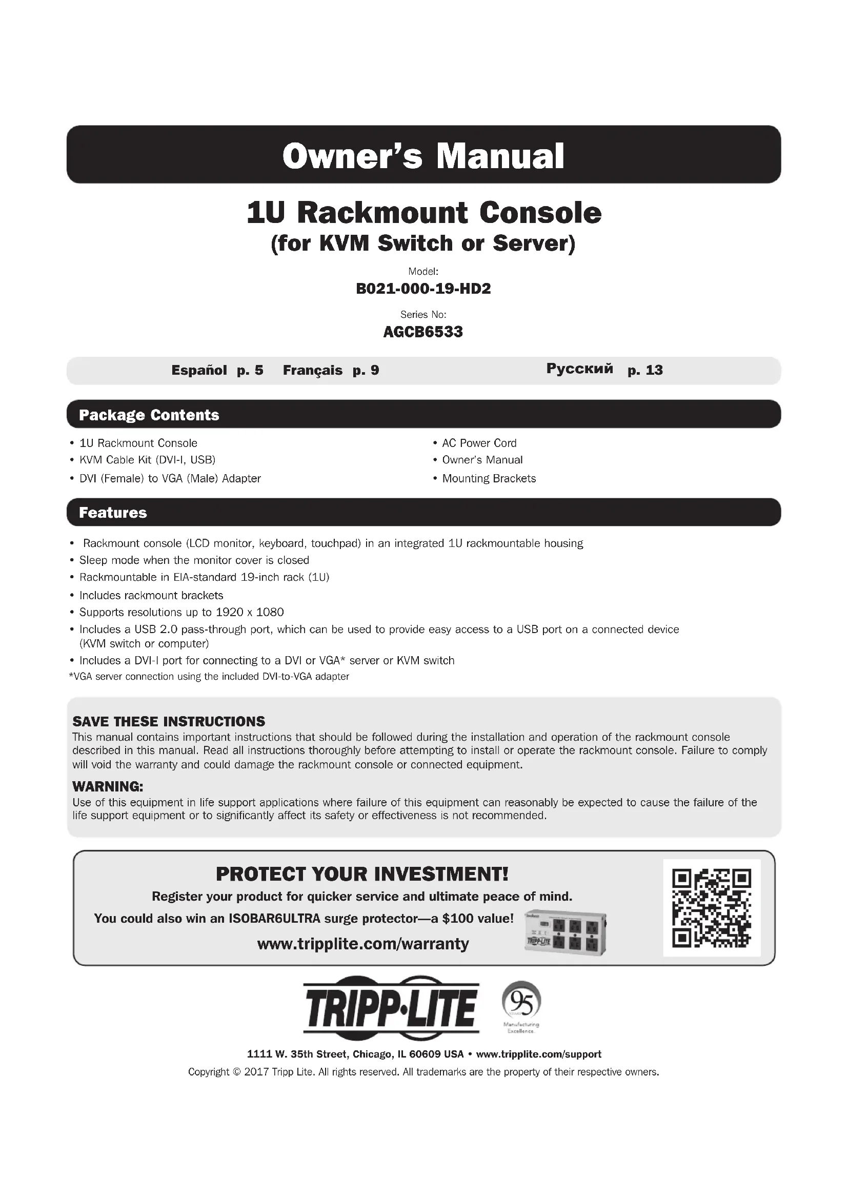 Owner’s Manual 1U Rackmount Console (for KVM Switch or Server) Model: B021-000-19-HD2Series No: AGCB6533Package ContentsFeatures• Rackmount console (LCD monitor, keyboard, touchpad) in an integrated 1U rackmountable housing• Sleep mode when the monitor cover is closed • Rackmountable in EIA-standard 19-inch rack (1U) • Includes rackmount brackets• Supports resolutions up to 1920 x 1080