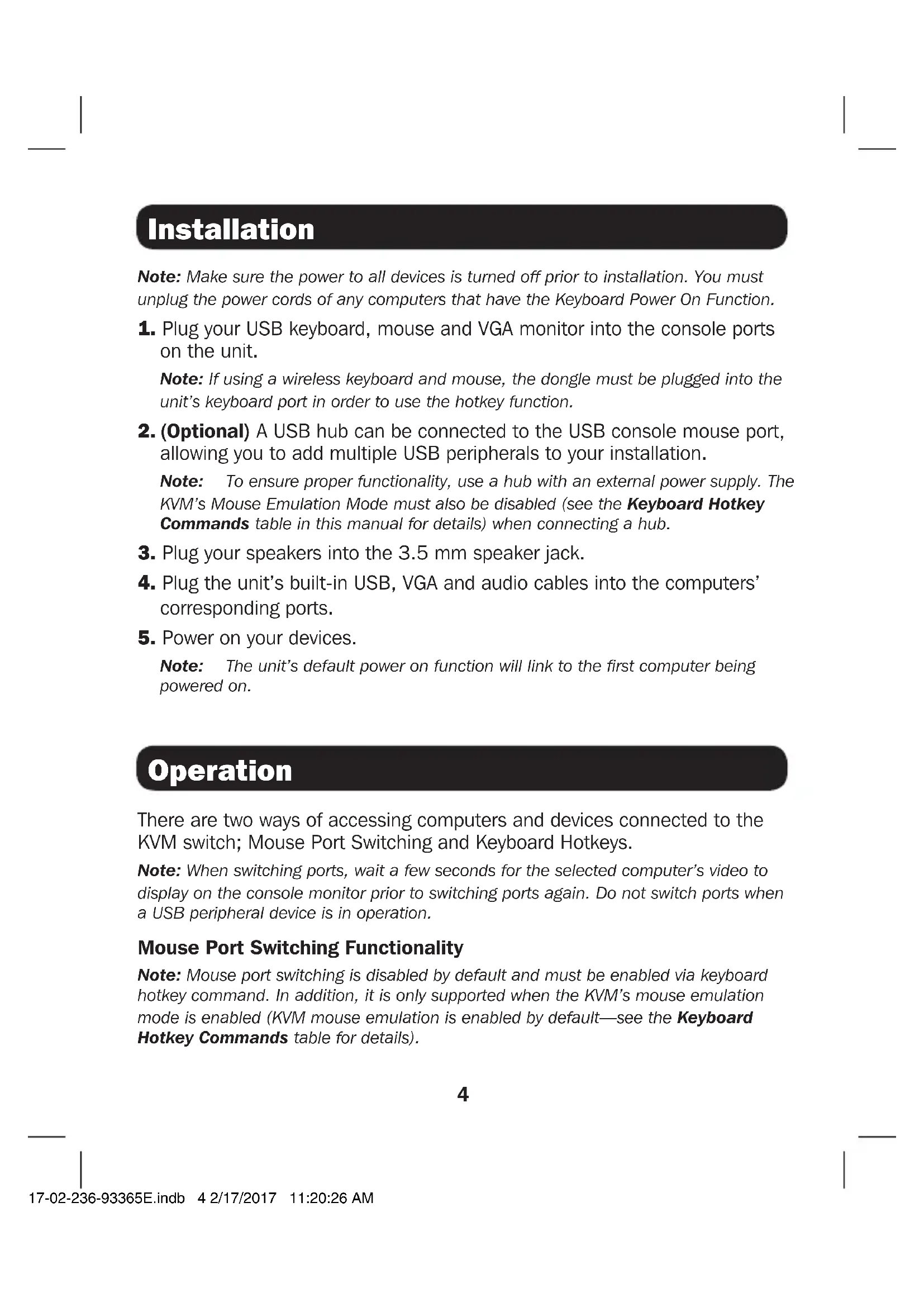 - Computer with USB ports 17-02-236-93365E.indb 3 2/17/2017 11:20:26 AM4 Installation Operation Note: Make sure the power to all devices is turned off prior to installation. You must unplug the power cords of any computers that have the Keyboard Power On Function.
