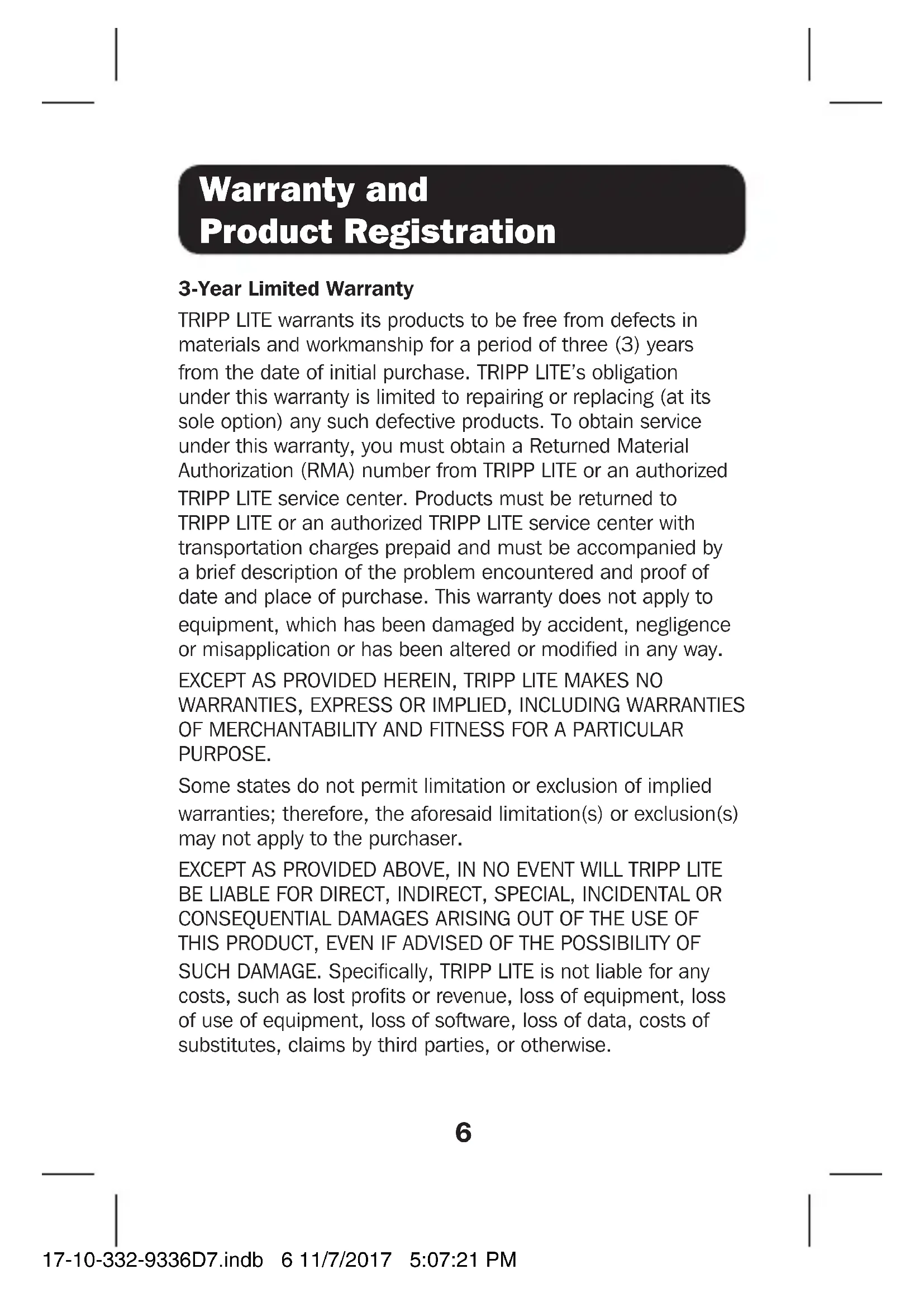 OF MERCHANTABILITY AND FITNESS FOR A PARTICULAR PURPOSE. Some states do not permit limitation or exclusion of implied warranties; therefore, the aforesaid limitation(s) or exclusion(s) may not apply to the purchaser. EXCEPT AS PROVIDED ABOVE, IN NO EVENT WILL TRIPP LITE BE LIABLE FOR DIRECT, INDIRECT, SPECIAL, INCIDENTAL OR CONSEQUENTIAL DAMAGES ARISING OUT OF THE USE OF THIS PRODUCT, EVEN IF ADVISED OF THE POSSIBILITY OF SUCH DAMAGE. Specifically, TRIPP LITE is not liable for any costs, such as lost profits or revenue, loss of equipment, loss of use of equipment, loss of software, loss of data, costs of substitutes, claims by third parties, or otherwise. 17-10-332-9336D7.indb 6 11/7/2017 5:07:21 PM7 Warranty and Product Registration Product Registration Visit www.tripplite.com/warranty today to register your new Tripp Lite product. You’ll be automatically entered into a drawing for a chance to win a FREE Tripp Lite product!*