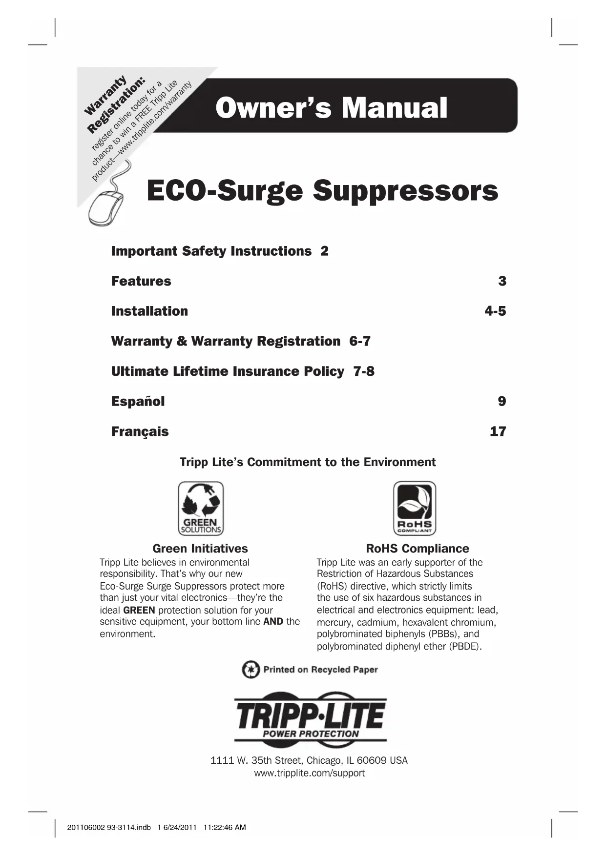 Warranty Registration: register online today for a chance to win a FREE Tripp Lite product—www.tripplite.com/warranty Owner’s Manual ECO-Surge Suppressors Important Safety Instructions 2 Features 3 Installation 4-5 Warranty & Warranty Registration 6-7 Ultimate Lifetime Insurance Policy 7-8 Español 9 Français 17 Tripp Lite’s Commitment to the Environment 1111 W. 35th Street, Chicago, IL 60609 USAwww.tripplite.com/support Green Initiatives Tripp Lite believes in environmental responsibility. That’s why our new Eco-Surge Surge Suppressors protect more than just your vital electronics—they’re the ideal GREEN protection solution for your sensitive equipment, your bottom line AND the environment. RoHS Compliance Tripp Lite was an early supporter of the Restriction of Hazardous Substances (RoHS) directive, which strictly limits the use of six hazardous substances in electrical and electronics equipment: lead, mercury, cadmium, hexavalent chromium, polybrominated biphenyls (PBBs), and polybrominated diphenyl ether (PBDE).201106002 93-3114.indb 1 6/24/2011 11:22:46 AM2 Important Safety Instructions