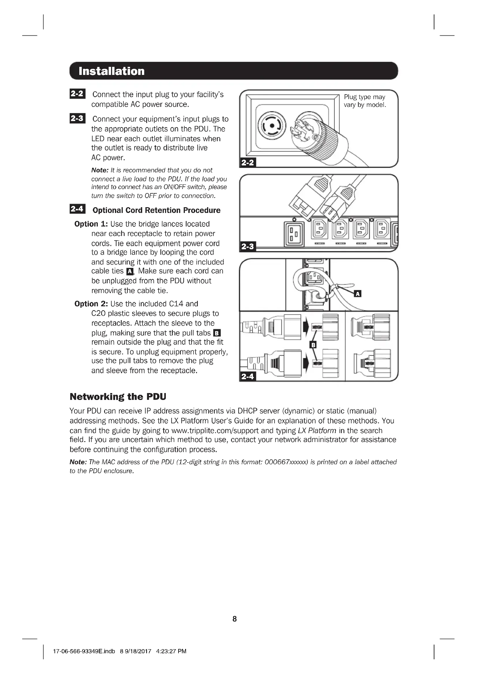remain outside the plug and that the fit is secure. To unplug equipment properly, use the pull tabs to remove the plug and sleeve from the receptacle. Plug type may vary by model. Networking the PDU Your PDU can receive IP address assignments via DHCP server (dynamic) or static (manual) addressing methods. See the LX Platform User’s Guide for an explanation of these methods. You can find the guide by going to www.tripplite.com/support and typing LX Platform in the search field. If you are uncertain which method to use, contact your network administrator for assistance before continuing the configuration process. Note: The MAC address of the PDU (12-digit string in this format: 000667xxxxxx) is printed on a label attached to the PDU enclosure. 17-06-566-93349E.indb 8 9/18/2017 4:23:27 PMNetwork Network Input Phase Load Bank Outlet Configuration Environment Mobile Access