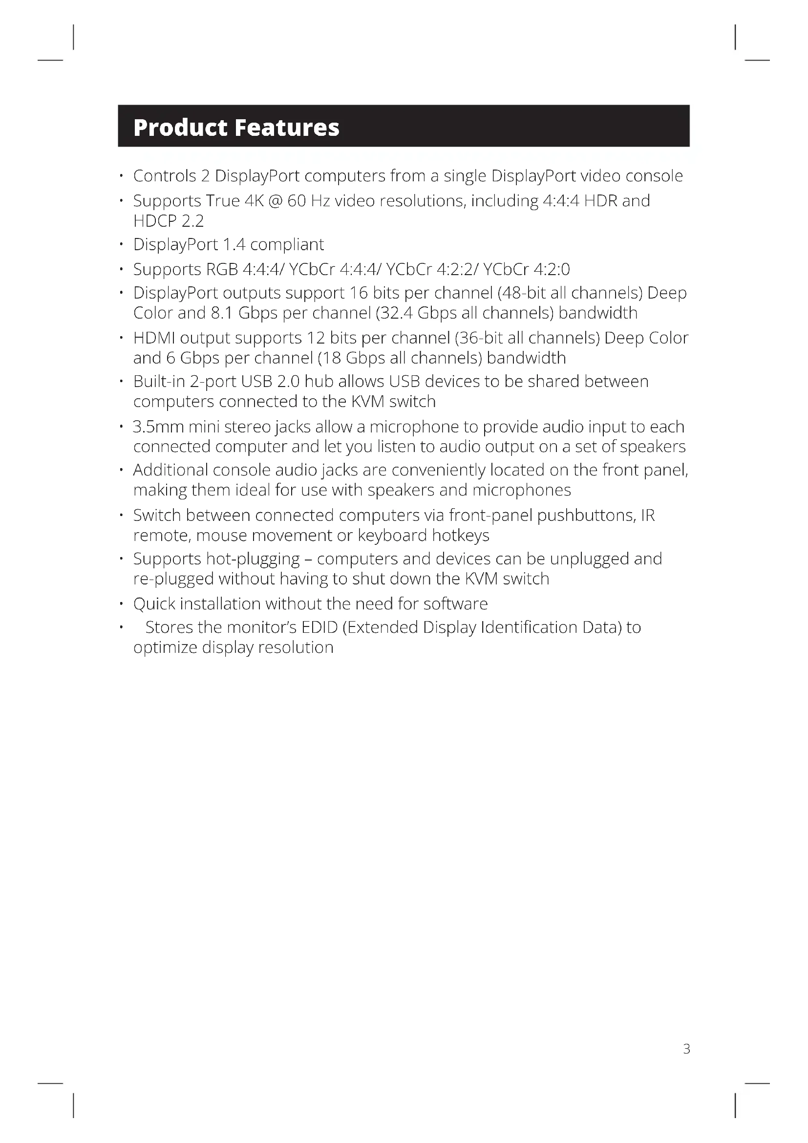 - Controls 2 DisplayPort computers from a single DisplayPort video console