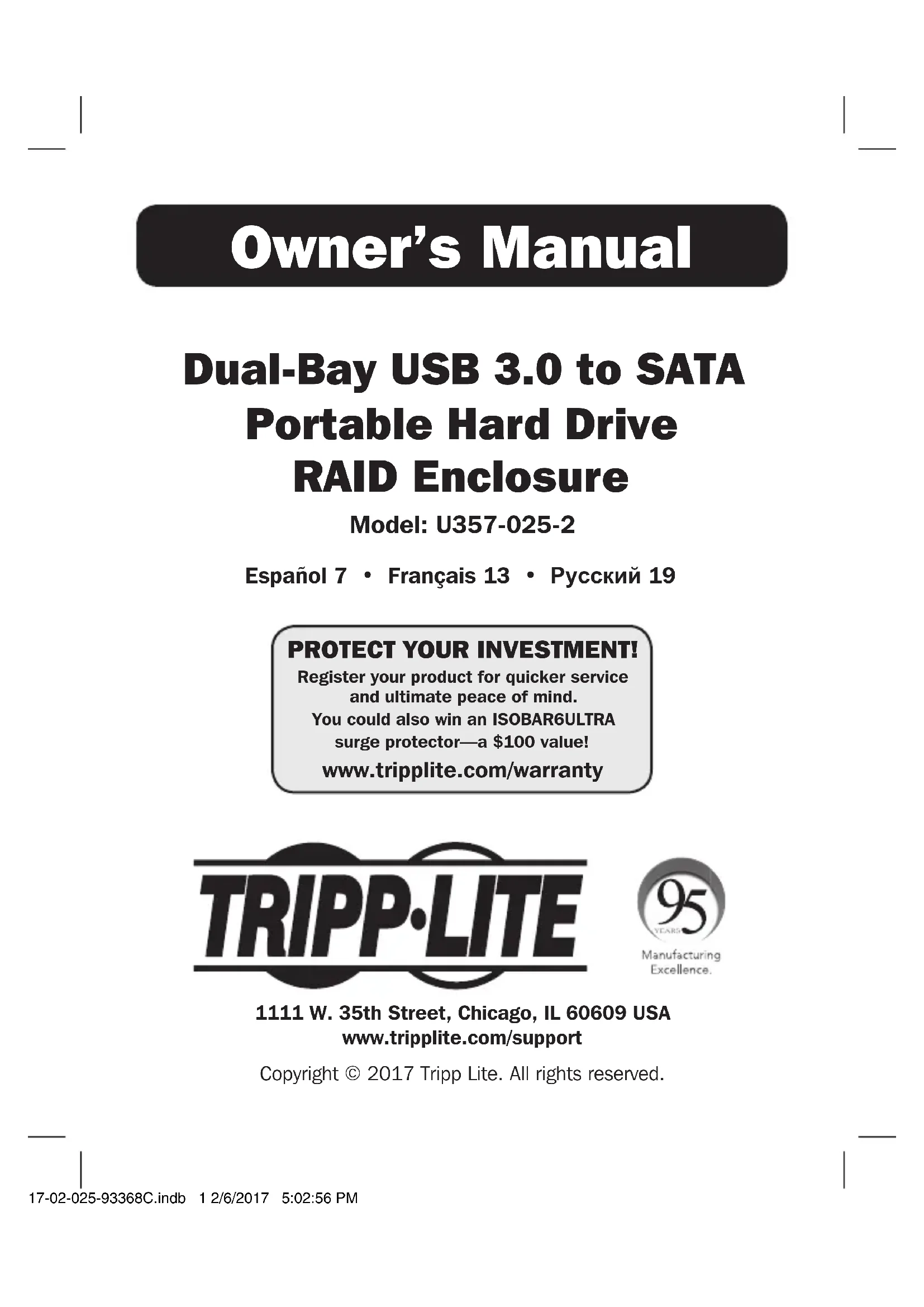 Owner’s Manual Dual-Bay USB 3.0 to SATA Portable Hard Drive RAID Enclosure Model: U357-025-2 Español 7 • Français 13 • Русский 19 PROTECT YOUR INVESTMENT! Register your product for quicker service and ultimate peace of mind. You could also win an ISOBAR6ULTRA surge protector—a $100 value! www.tripplite.com/warranty 1111 W. 35th Street, Chicago, IL 60609 USA www.tripplite.com/support Copyright © 2017 Tripp Lite. All rights reserved. 17-02-025-93368C.indb 1 2/6/2017 5:02:56 PM2 Package Contents System Requirements Product Features