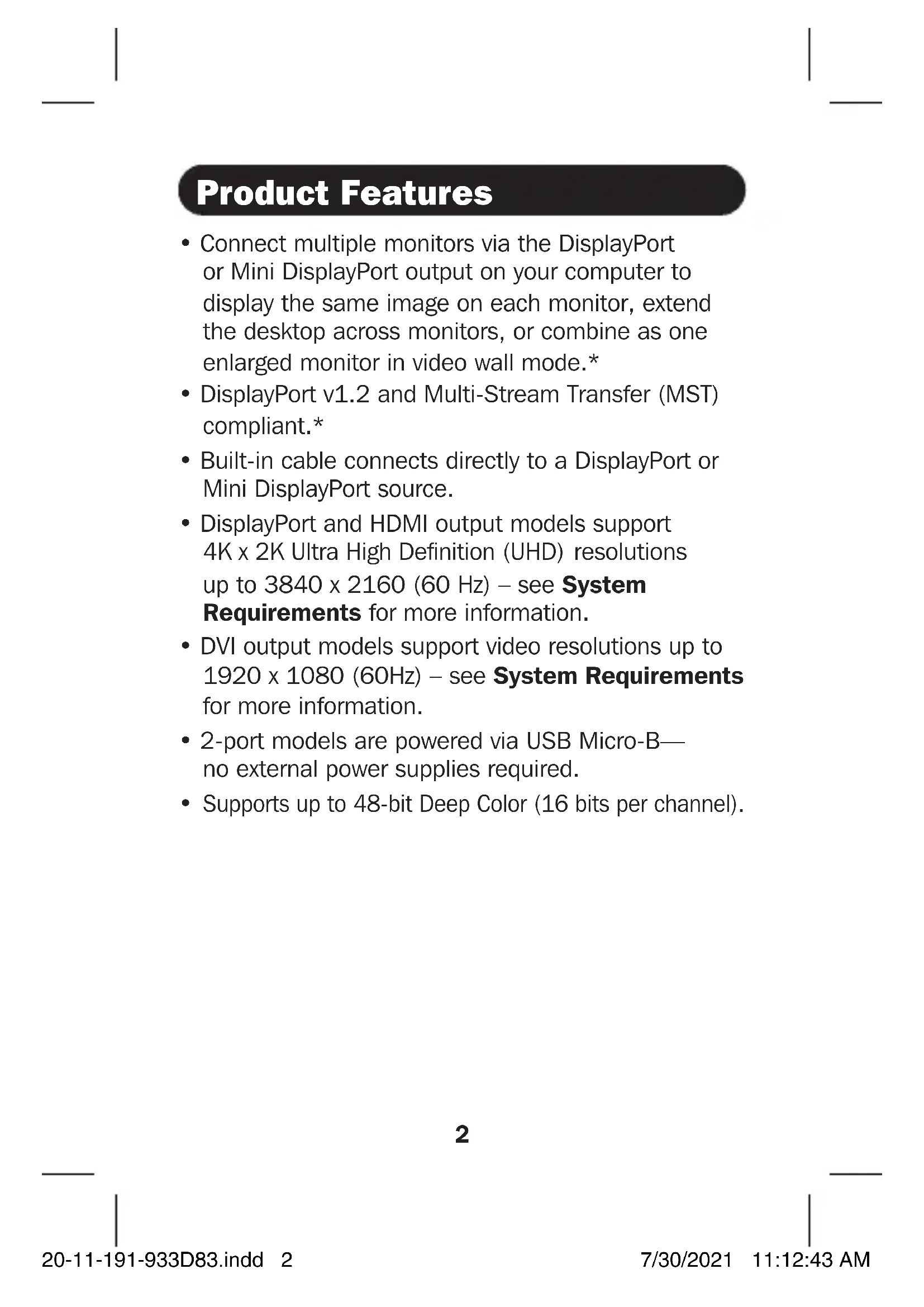 - Backward compatible with most DisplayPort 1.1a equipment running current graphics drivers. The feature set is limited to the attached equipment’s capabilities (e.g. you may be limited to displaying in Clone / Mirror mode only). Compatibility with older graphics cards is not guaranteed. 20-11-191-933D83.indd 320-11-191-933D83.indd 3 7/30/2021 11:12:43 AM7/30/2021 11:12:43 AM4 System Requirements