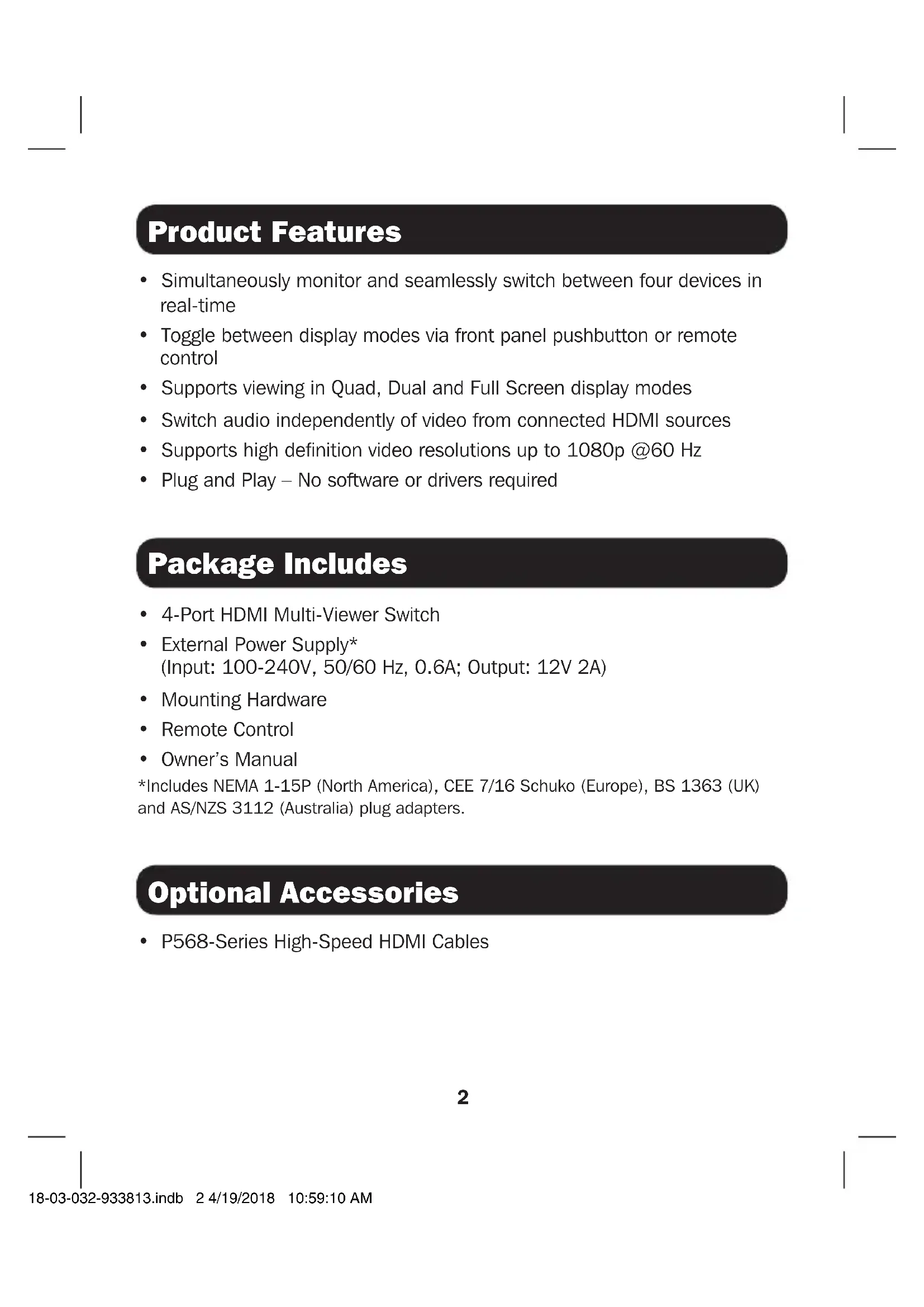 - P568-Series High-Speed HDMI Cables 18-03-032-933813.indb 2 4/19/2018 10:59:10 AM3 Standard Installation