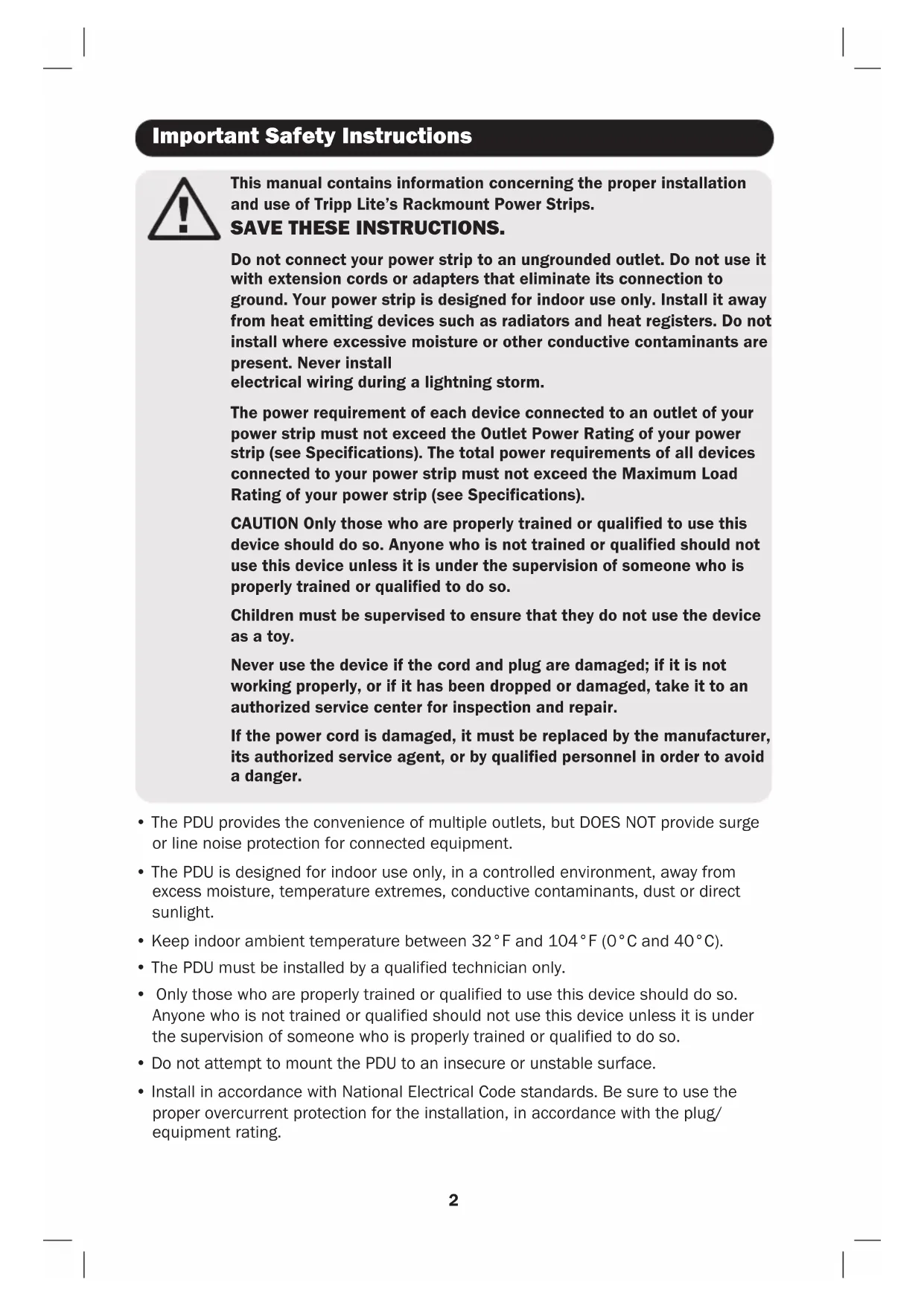 surge protector in our monthly drawing! tripplite.com/warranty TrippLite.Eaton.com/supportCopyright © 2023 Tripp Lite. All rights reserved.2 Important Safety Instructions This manual contains information concerning the proper installation and use of Tripp Lite’s Rackmount Power Strips. SAVE THESE INSTRUCTIONS. Do not connect your power strip to an ungrounded outlet. Do not use it with extension cords or adapters that eliminate its connection to ground. Your power strip is designed for indoor use only. Install it away from heat emitting devices such as radiators and heat registers. Do not install where excessive moisture or other conductive contaminants are present. Never install electrical wiring during a lightning storm. The power requirement of each device connected to an outlet of your power strip must not exceed the Outlet Power Rating of your power strip (see Specifications). The total power requirements of all devices connected to your power strip must not exceed the Maximum Load Rating of your power strip (see Specifications). CAUTION Only those who are properly trained or qualified to use this device should do so. Anyone who is not trained or qualified should not use this device unless it is under the supervision of someone who is properly trained or qualified to do so. Children must be supervised to ensure that they do not use the device as a toy. Never use the device if the cord and plug are damaged; if it is not working properly, or if it has been dropped or damaged, take it to an authorized service center for inspection and repair. If the power cord is damaged, it must be replaced by the manufacturer, its authorized service agent, or by qualified personnel in order to avoid a danger.