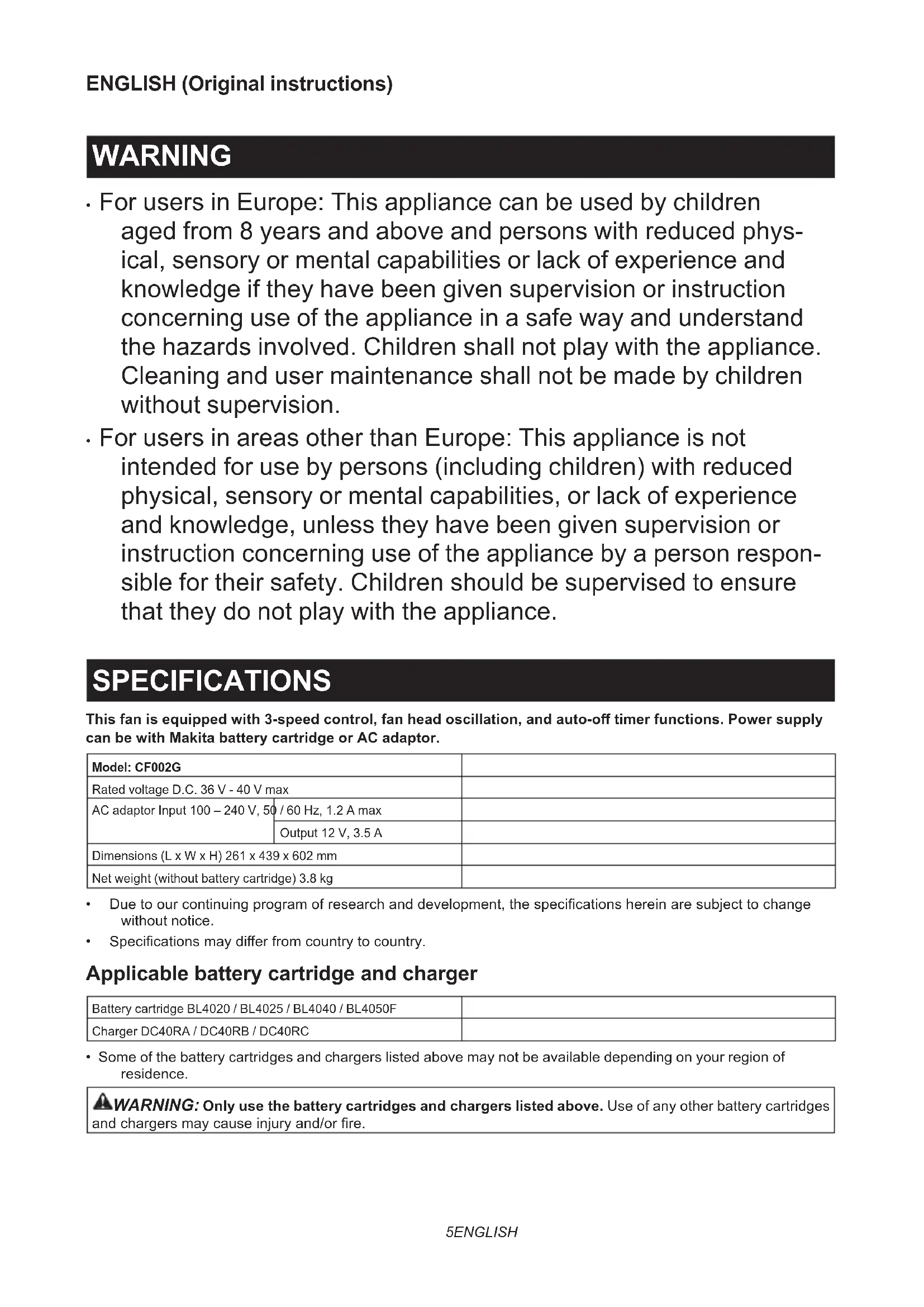 - For users in areas other than Europe: This appliance is not intended for use by persons (including children) with reduced physical, sensory or mental capabilities, or lack of experience and knowledge, unless they have been given supervision or instruction concerning use of the appliance by a person respon- sible for their safety. Children should be supervised to ensure that they do not play with the appliance. SPECIFICATIONS This fan is equipped with 3-speed control, fan head oscillation, and auto-o timer functions. Power supply can be with Makita battery cartridge or AC adaptor. Model: CF002GRated voltage D.C. 36 V - 40 V maxAC adaptor Input 100 – 240 V, 50 / 60 Hz, 1.2 A maxOutput 12 V, 3.5 ADimensions (L x W x H) 261 x 439 x 602 mmNet weight (without battery cartridge) 3.8 kg