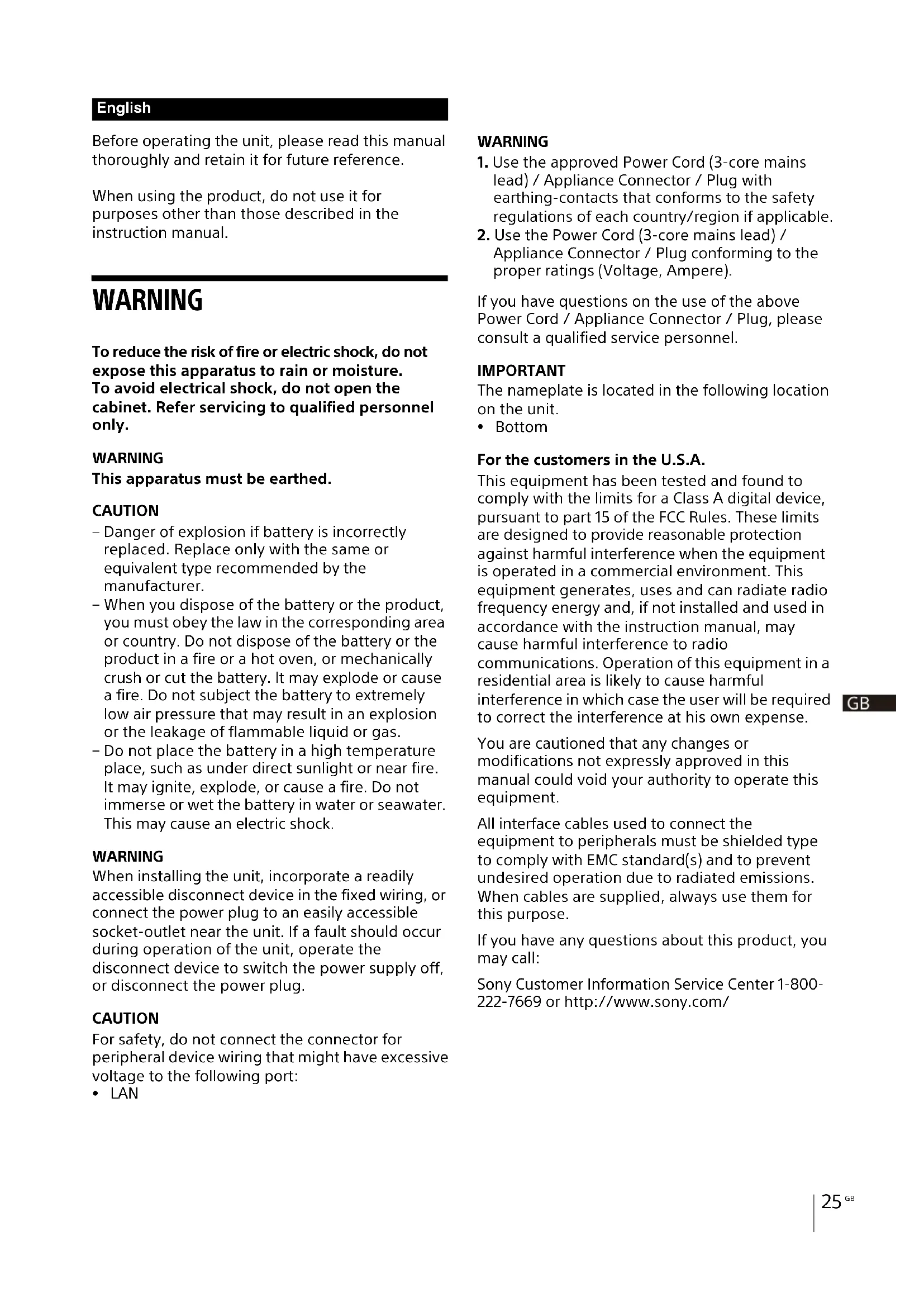 Appliance Connector / Plug conforming to the proper ratings (Voltage, Ampere). If you have questions on the use of the above Power Cord / Appliance Connector / Plug, please consult a qualified service personnel. IMPORTANT The nameplate is located in the following location on the unit. Bottom For the customers in the U.S.A. This equipment has been tested and found to comply with the limits for a Class A digital device, pursuant to part 15 of the FCC Rules. These limits are designed to provide reasonable protection against harmful interference when the equipment is operated in a commercial environment. This equipment generates, uses and can radiate radio frequency energy and, if not installed and used in accordance with the instruction manual, may cause harmful interference to radio communications. Operation of this equipment in a residential area is likely to cause harmful interference in which case the user will be required to correct the interference at his own expense. You are cautioned that any changes or modifications not expressly approved in this manual could void your authority to operate this equipment. All interface cables used to connect the equipment to peripherals must be shielded type to comply with EMC standard(s) and to prevent undesired operation due to radiated emissions. When cables are supplied, always use them for this purpose. If you have any questions about this product, you may call: Sony Customer Information Service Center 1-800- 222-7669 or http://www.sony.com/ EnglishGB