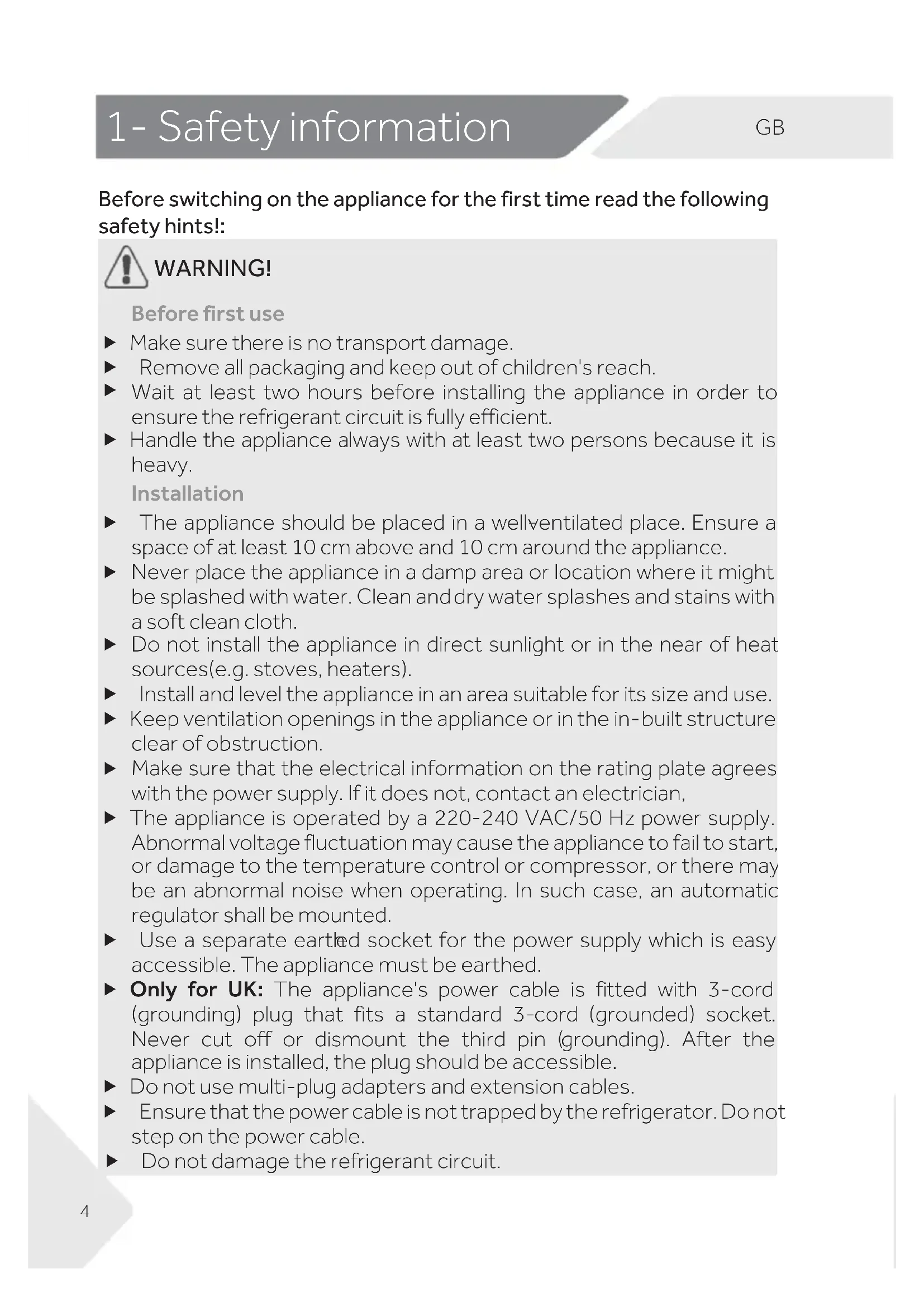 Before switching on the appliance for the first time read the following safety hints!: WARNING! Before first use Make sure there is no transport damage. Remove all packaging and keep out of children's reach. Wait at least two hours before installing the appliance in order to ensure the refrigerant circuit is fully efficient. Handle the appliance always with at least two persons because it is heavy. Installation The appliance should be placed in a well-ventilated place. Ensure a space of at least 10 cm above and 10 cm around the appliance. Never place the appliance in a damp area or location where it might be splashed with water. Clean and dry water splashes and stains with a soft clean cloth. Do not install the appliance in direct sunlight or in the near of heat sources(e.g. stoves, heaters). Install and level the appliance in an area suitable for its size and use. Keep ventilation openings in the appliance or in the in-built structure clear of obstruction. Make sure that the electrical information on the rating plate agrees with the power supply. If it does not, contact an electrician, The appliance is operated by a 220-240 VAC/50 Hz power supply. Abnormal voltagefluctuation may cause the appliance to fail tostart, or damage to the temperature control or compressor, or there may be an abnormal noise when operating. In such case, an automatic regulator shall be mounted. Use a separate earthed socket for the power supply which is easy accessible. The appliance must be earthed. Only for UK: The appliance's power cable is fitted with 3-cord (grounding) plug that fits a standard 3-cord (grounded) socket. Never cut off or dismount the third pin (grounding). After the appliance is installed, the plug should be accessible. Do not use multi-plug adapters and extension cables. Ensure that the power cable is not trapped by the refrigerator. Do not step on the power cable. Do not damage the refrigerant circuit.