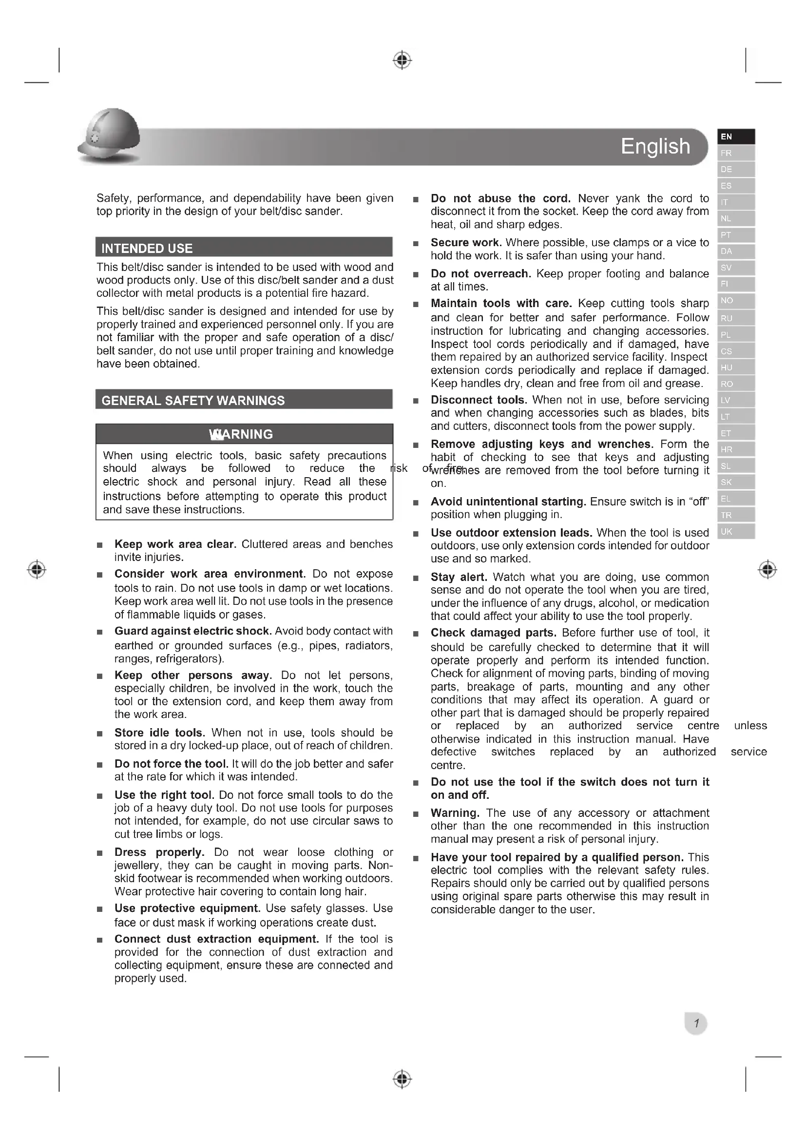 Safety, performance, and dependability have been given top priority in the design of your belt/disc sander. INTENDED USE This belt/disc sander is intended to be used with wood and wood products only. Use of this disc/belt sander and a dust