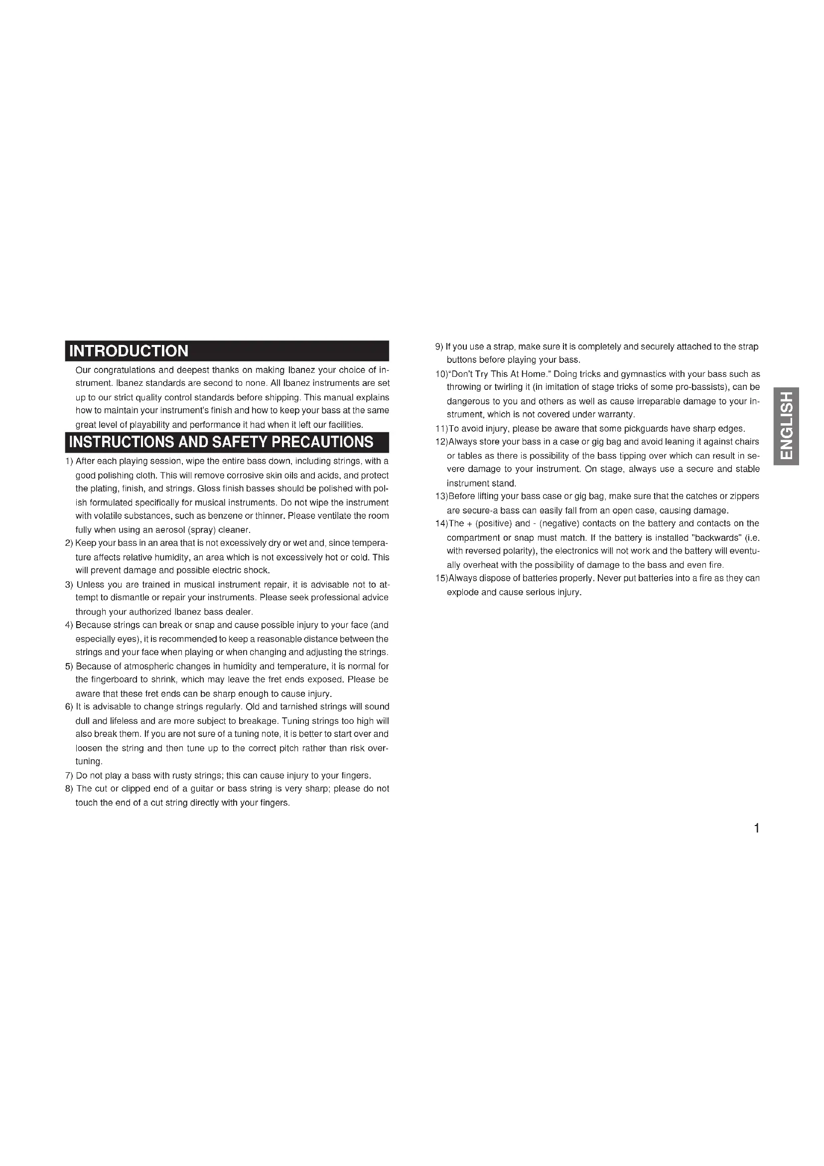 INTRODUCTION Our congratulations and deepest thanks on making Ibanez your choice of in- strument. Ibanez standards are second to none. All Ibanez instruments are set up to our strict quality control standards before shipping. This manual explains how to maintain your instrument's finish and how to keep your bass at the same great level of playability and performance it had when it left our facilities.