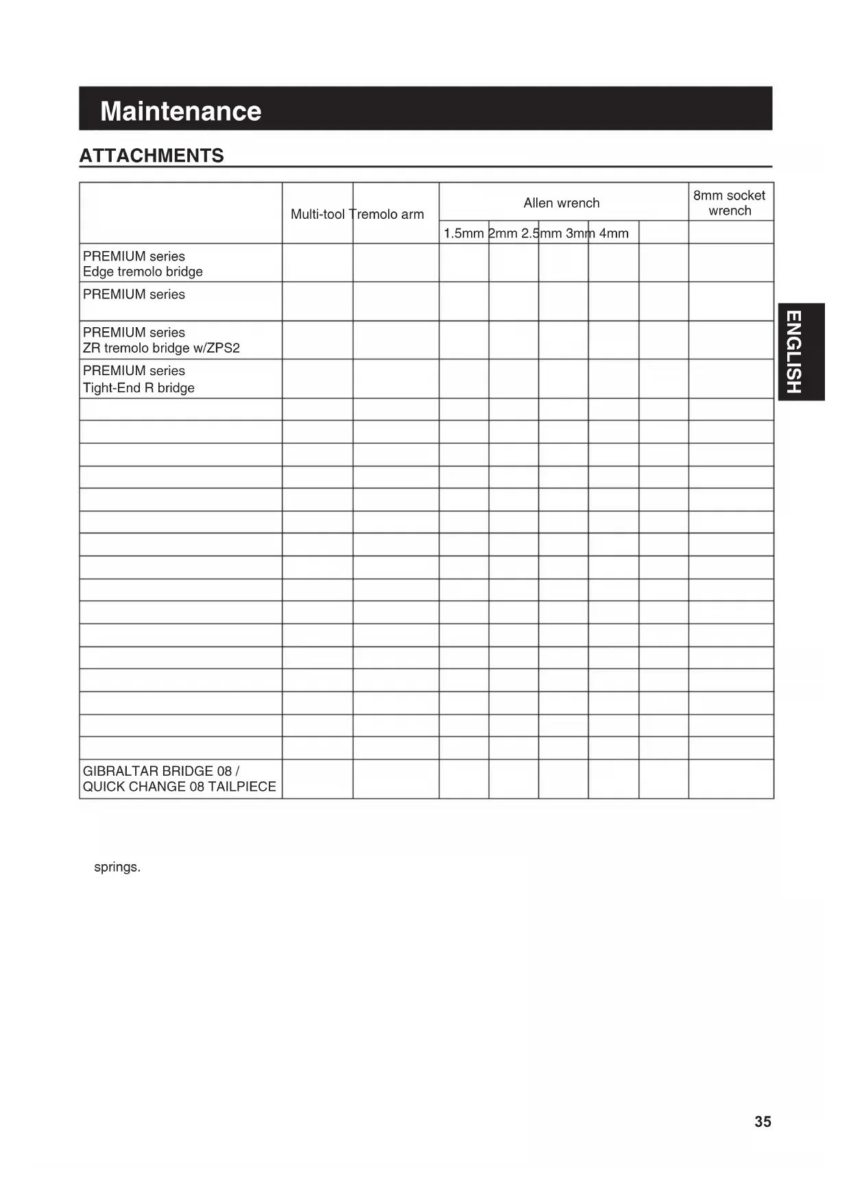 EdgeⅢ tremolo bridge ○ ○○○○ Edge-ZeroⅡ w/ ZPS ○ ○ ○○ Edge-ZeroⅡ w/o ZPS ○ ○ ○○ FAT6 tremolo bridge ○○ ○○ FAT10 tremolo bridge ○○ ○○ FX EdgeⅢ bridge ○○○ FX EdgeⅢ-8 bridge ○○○ Gibraltar Standard 6/7/8 bridge ○ ○ ○ SAT10 tremolo bridge ○○ ○○ SAT-ProⅡ tremolo bridge ○○ ○○ STD tremolo bridge ○ STD-DL tremolo bridge ○ Tight-End bridge ○○ Tight-Tune bridge ○ ○○ ZR tremolo bridge w/ZPS2 ○ ○ ○○ SynchroniZR tremolo bridge ○○ GIBRALTAR BRIDGE 08 /
