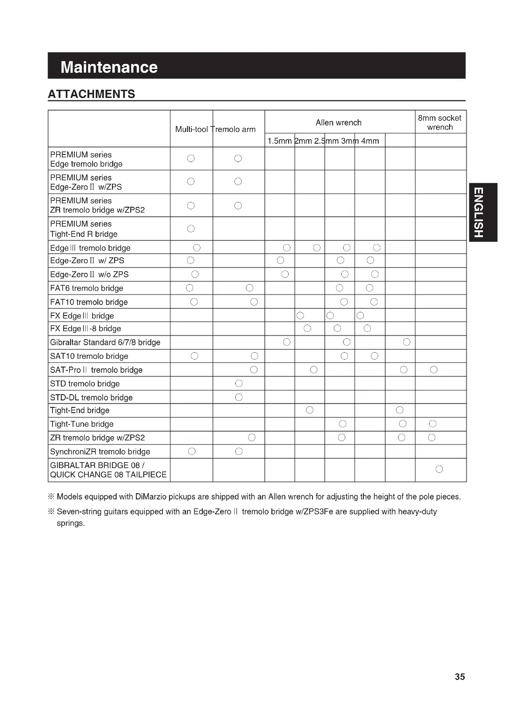 Models equipped with DiMarzio pickups are shipped with an Allen wrench for adjusting the height of the pole pieces. ※ Seven-string guitars equipped with an Edge-Zero ※Ⅱ tremolo bridge w/ZPS3Fe are supplied with heavy-duty springs.