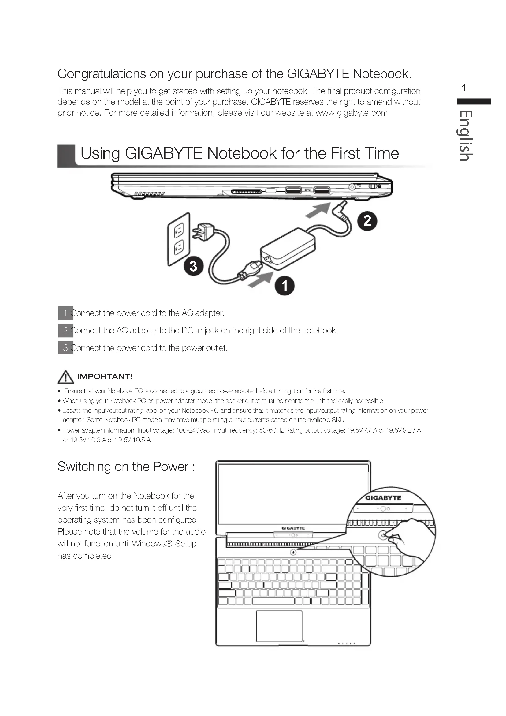 Congratulations on your purchase of the GIGABYTE Notebook. This manual will help you to get started with setting up your notebook. The final product configuration depends on the model at the point of your purchase. GIGABYTE reserves the right to amend without prior notice. For more detailed information, please visit our website at www.gigabyte.com1 Connect the power cord to the AC adapter.2 Connect the AC adapter to the DC-in jack on the right side of the notebook. 3 Connect the power cord to the power outlet. Switching on the Power : After you turn on the Notebook for the very first time, do not turn it off until the operating system has been configured. Please note that the volume for the audio will not function until Windows® Setup has completed. Using GIGABYTE Notebook for the First Time IMPORTANT! • Ensure that your Notebook PC is connected to a grounded power adapter before turning it on for the first time.• When using your Notebook PC on power adapter mode, the socket outlet must be near to the unit and easily accessible.
