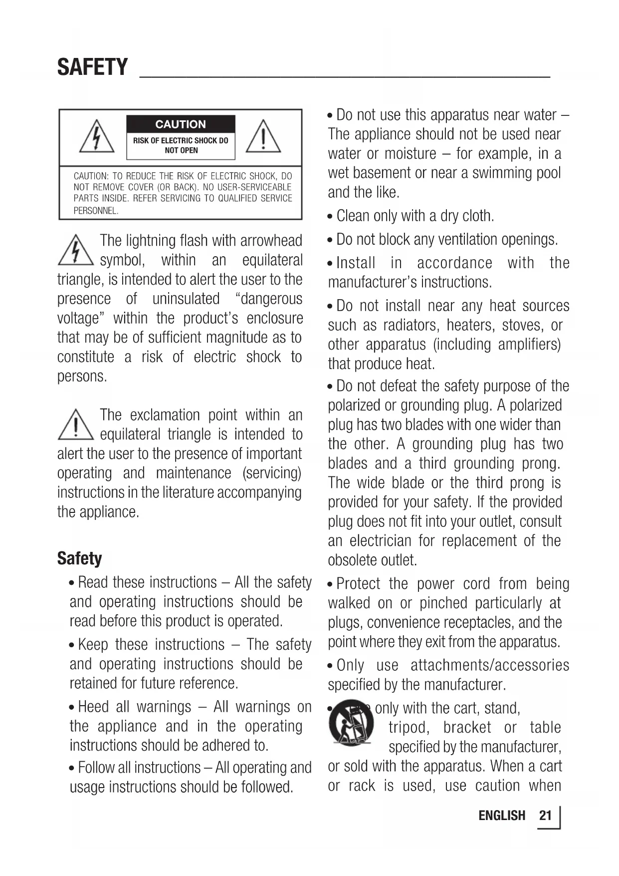 - Use only with the cart, stand, tripod, bracket or table specified by the manufacturer, or sold with the apparatus. When a cart or rack is used, use caution when CAUTION CAUTION: TO REDUCE THE RISK OF ELECTRIC SHOCK, DO NOT REMOVE COVER (OR BACK). NO USER-SERVICEABLE PARTS INSIDE. REFER SERVICING TO QUALIFIED SERVICE PERSONNEL.RISK OF ELECTRIC SHOCK DO NOT OPEN22 ENGLISH SAFETY ___________________________________ moving the cart/apparatus combination to avoid injury from tip-over.