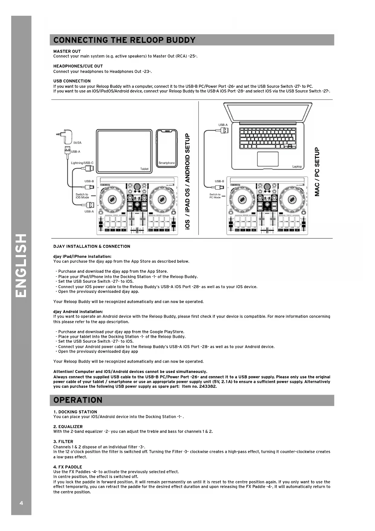 djay iPad/iPhone installation: You can purchase the djay app from the App Store as described below. - Purchase and download the djay app from the App Store. - Place your iPad/iPhone into the Docking Station -1- of the Reloop Buddy. - Set the USB Source Switch -27- to iOS. - Connect your iOS power cable to the Reloop Buddy‘s USB-A iOS Port -28- as well as to your iOS device. - Open the previously downloaded djay app. Your Reloop Buddy will be recognized automatically and can now be operated. djay Android installation: If you want to operate an Android device with the Reloop Buddy, please rst check if your device is compatible. For more information concerning this please refer to the app description. - Purchase and download your djay app from the Google PlayStore. - Place your tablet into the Docking Station -1- of the Reloop Buddy. - Set the USB Source Switch -27- to iOS. - Connect your Android power cable to the Reloop Buddy‘s USB-A iOS Port -28- as well as to your Android device. - Open the previously downloaded djay app Your Reloop Buddy will be recognized automatically and can now be operated. Attention! Computer and iOS/Android devices cannot be used simultaneously. Always connect the supplied USB cable to the USB-B PC/Power Port -26- and connect it to a USB power supply. Please only use the original power cable of your tablet / smartphone or use an appropriate power supply unit (5V, 2.1A) to ensure a sufcient power supply. Alternatively you can purchase the following USB power supply as spare part: Item no. 243382. OPERATION