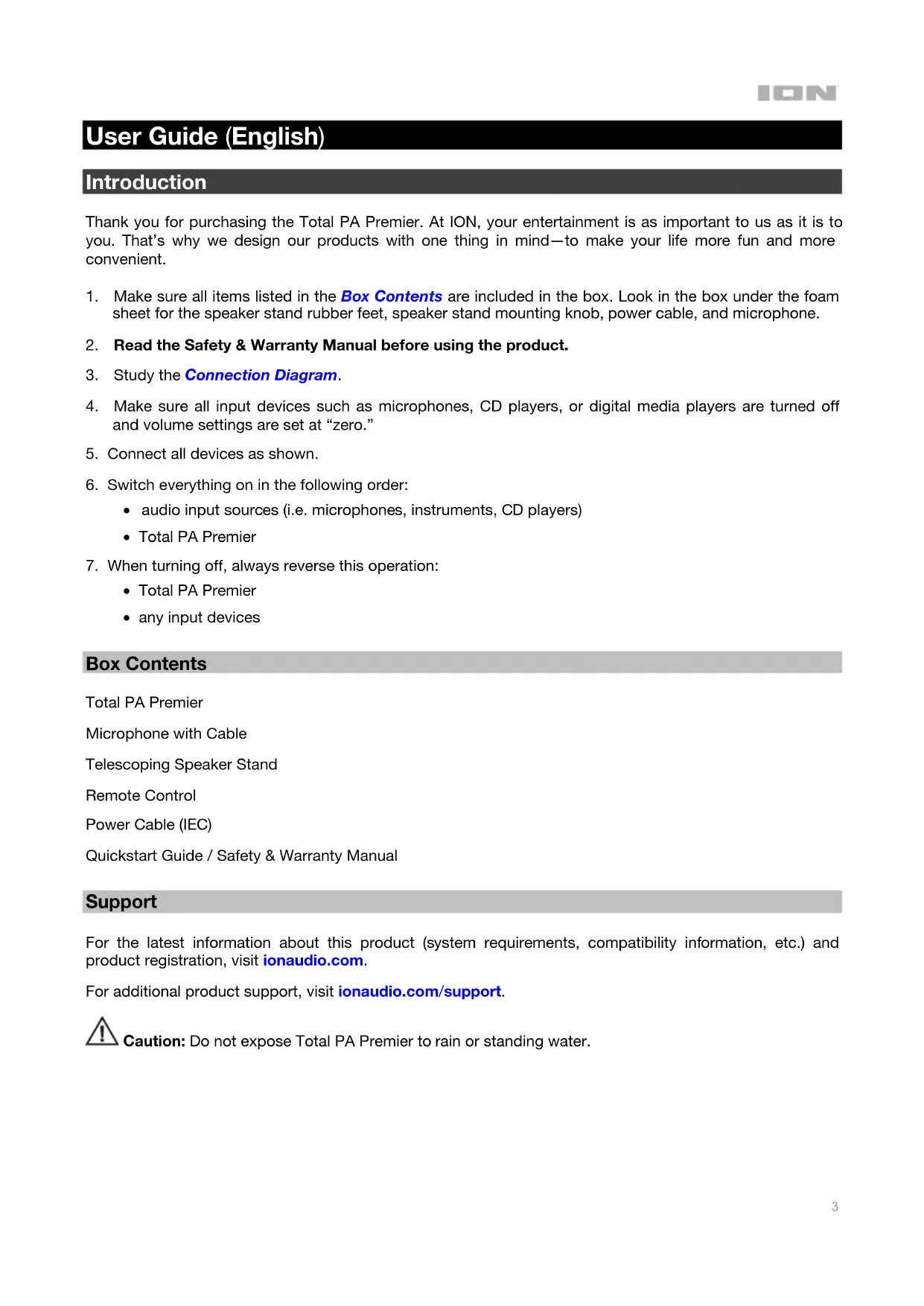 User Guide (English) Introduction Thank you for purchasing the Total PA Premier. At ION, your entertainment is as important to us as it is to you. That’s why we design our products with one thing in mind—to make your life more fun and more convenient.