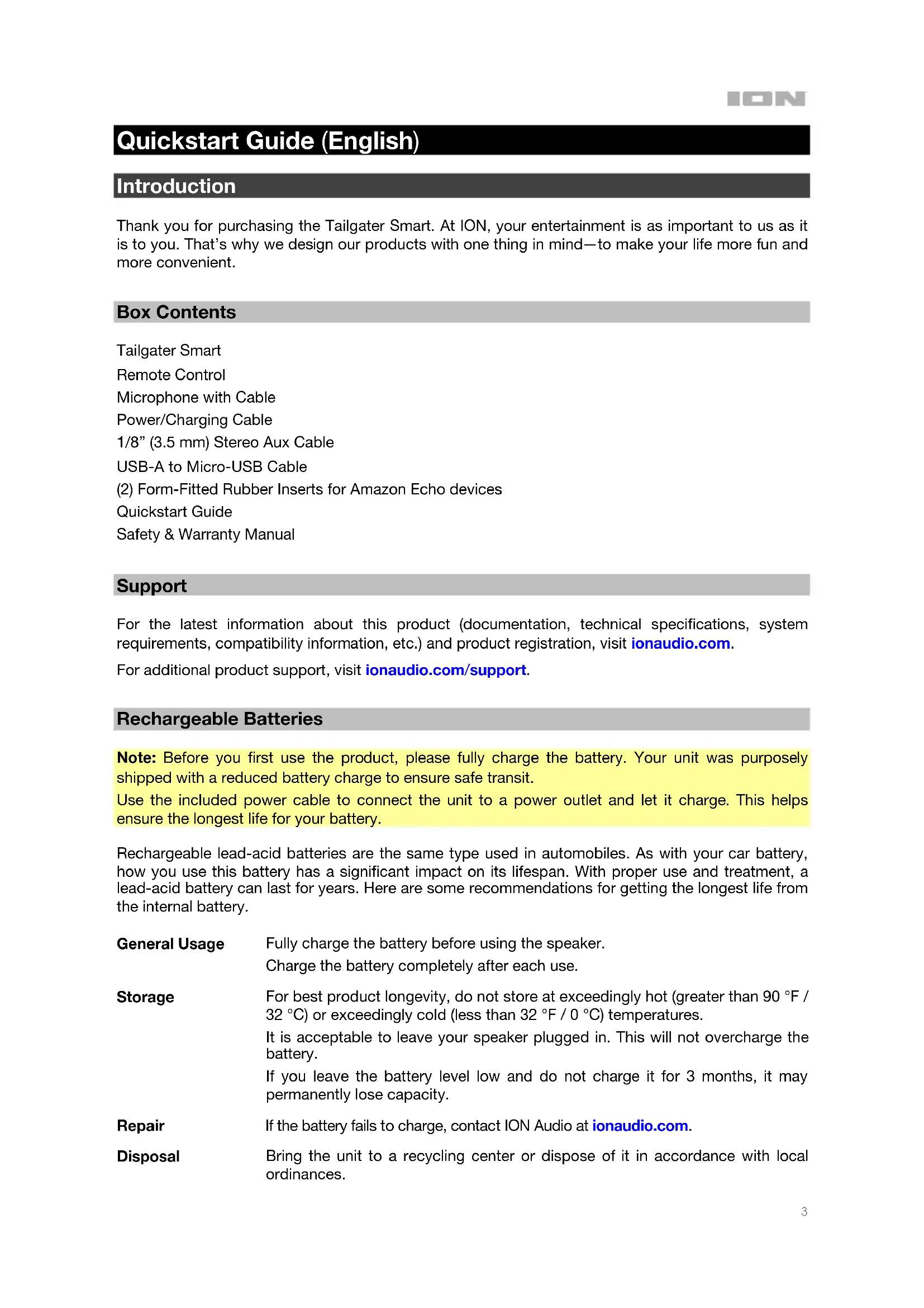 Quickstart Guide English ( 3 – 12 ) Guía de inicio rápido Español ( 13 – 22 ) Guide d’utilisation rapide Français ( 23 – 32 ) Appendix English ( 34 )23 Quickstart Guide (English) Introduction Thank you for purchasing the Tailgater Smart. At ION, your entertainment is as important to us as it is to you. That’s why we design our products with one thing in mind—to make your life more fun and more convenient. Box Contents Tailgater Smart Remote Control Microphone with Cable Power/Charging Cable 1/8” (3.5 mm) Stereo Aux Cable USB-A to Micro-USB Cable (2) Form-Fitted Rubber Inserts for Amazon Echo devices Quickstart Guide Safety & Warranty Manual Support For the latest information about this product (documentation, technical specifications, system requirements, compatibility information, etc.) and product registration, visit ionaudio.com. For additional product support, visit ionaudio.com/support. Rechargeable Batteries Note: Before you first use the product, please fully charge the battery. Your unit was purposely shipped with a reduced battery charge to ensure safe transit. Use the included power cable to connect the unit to a power outlet and let it charge. This helps ensure the longest life for your battery. Rechargeable lead-acid batteries are the same type used in automobiles. As with your car battery, how you use this battery has a significant impact on its lifespan. With proper use and treatment, a lead-acid battery can last for years. Here are some recommendations for getting the longest life from the internal battery. General Usage Fully charge the battery before using the speaker. Charge the battery completely after each use. Storage For best product longevity, do not store at exceedingly hot (greater than 90 °F / 32 °C) or exceedingly cold (less than 32 °F / 0 °C) temperatures. It is acceptable to leave your speaker plugged in. This will not overcharge the battery. If you leave the battery level low and do not charge it for 3 months, it may permanently lose capacity. Repair If the battery fails to charge, contact ION Audio at ionaudio.com. Disposal Bring the unit to a recycling center or dispose of it in accordance with local ordinances.4 Setup