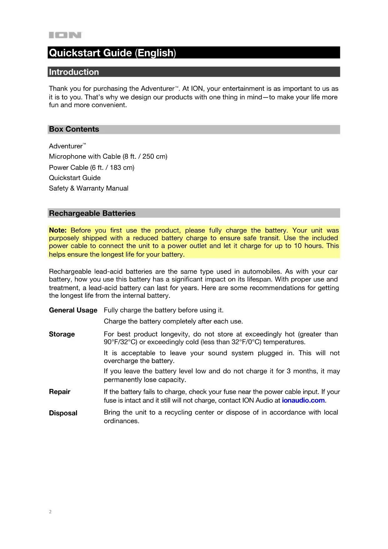 Rechargeable Batteries Note: Before you first use the product, please fully charge the battery. Your unit was purposely shipped with a reduced battery charge to ensure safe transit. Use the included power cable to connect the unit to a power outlet and let it charge for up to 10 hours. This helps ensure the longest life for your battery. Rechargeable lead-acid batteries are the same type used in automobiles. As with your car battery, how you use this battery has a significant impact on its lifespan. With proper use and treatment, a lead-acid battery can last for years. Here are some recommendations for getting the longest life from the internal battery. General Usage Fully charge the battery before using it. Charge the battery completely after each use. Storage For best product longevity, do not store at exceedingly hot (greater than 90°F/32°C) or exceedingly cold (less than 32°F/0°C) temperatures. It is acceptable to leave your sound system plugged in. This will not overcharge the battery. If you leave the battery level low and do not charge it for 3 months, it may permanently lose capacity. Repair If the battery fails to charge, check your fuse near the power cable input. If your fuse is intact and it still will not charge, contact ION Audio at ionaudio.com. Disposal Bring the unit to a recycling center or dispose of in accordance with local ordinances.3