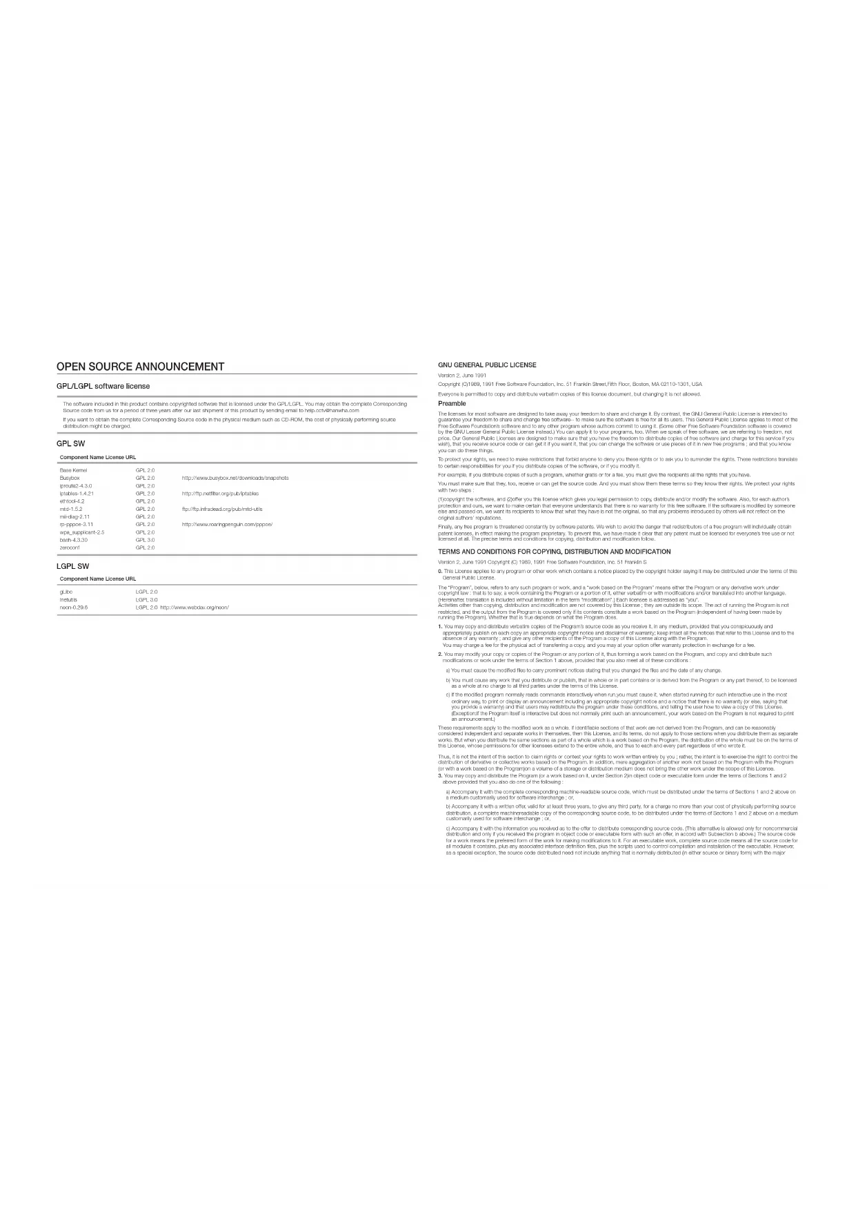 The MIT License Some software components of this product incorporate source code covered under the MIT license as follows MIT License 2.0 - Acewidget, bettermeans, jquery-ui, libxml, libxml2, Mesa3D-MesaLib,mwEmbed,OpenGL Samples Pack, Wide Studio, xorg-server, dropbear-2012.55, ncurses-5.7 Copyright (c) 2011, The Dojo Foundation Copyright 2010, AUTHORS.txt (http://jqueryui.com/about) Dual licensed under the MIT or GPL Version 2 licenses. - http://jquery.org/license - http://docs.jquery.com/UI/Widget Copyright Daniel Veillard Copyright Igor Zlatovic <igor@zlatkovic.com> Copyright Aleksey Sanin Copyright Gary Pennington <Gary.Pennington@uk.sun.com> Copyright Alfred Mickautsch <alfred@mickautsch.de> Copyright Bjorn Reese <bjorn.reese@systematic.dk> Copyright Joel W. Reed Copyright William Brack <wbrack@mmm.com.hk> Copyright (c) 2007-2010 The Khronos Group Inc. Copyright Atish Kumar Patra Copyright (c) 2006 Free Software Foundation, Inc. Permission is hereby granted, free of charge, to any person obtaining a copy of this software and associated documentation files (the "Software"), to deal in the Software without restriction, including without limitation the rights to use, copy, modify, merge, publish, distribute, sublicense, and/or sell copies of the Software, and to permit persons to whom the Software is furnished to do so, subject to the following conditions: The above copyright notice and this permission notice shall be included in all copies or substantial portions of the Software. THE SOFTWARE IS PROVIDED "AS IS", WITHOUT WARRANTY OF ANY KIND, EXPRESS OR IMPLIED, INCLUDING BUT NOT LIMITED TO THE WARRANTIES OF MERCHANTABILITY, FITNESS FOR A PARTICULAR PURPOSE AND NONINFRINGEMENT. IN NO EVENT SHALL THE AUTHORS OR COPYRIGHT HOLDERS BE LIABLE FOR ANY CLAIM, DAMAGES OR OTHER LIABILITY, WHETHER IN AN ACTION OF CONTRACT, TORT OR OTHERWISE, ARISING FROM, OUT OF OR IN CONNECTION WITH THE SOFTWARE OR THE USE OR OTHER DEALINGS IN THE SOFTWARE. Mozilla Public License Since we, at Hanwha Techwin, used the Mozilla Firefox component without modifying the source code according to the MOZILLA Public license 1.1, we are not obliged to provide the source code of the corresponding component.