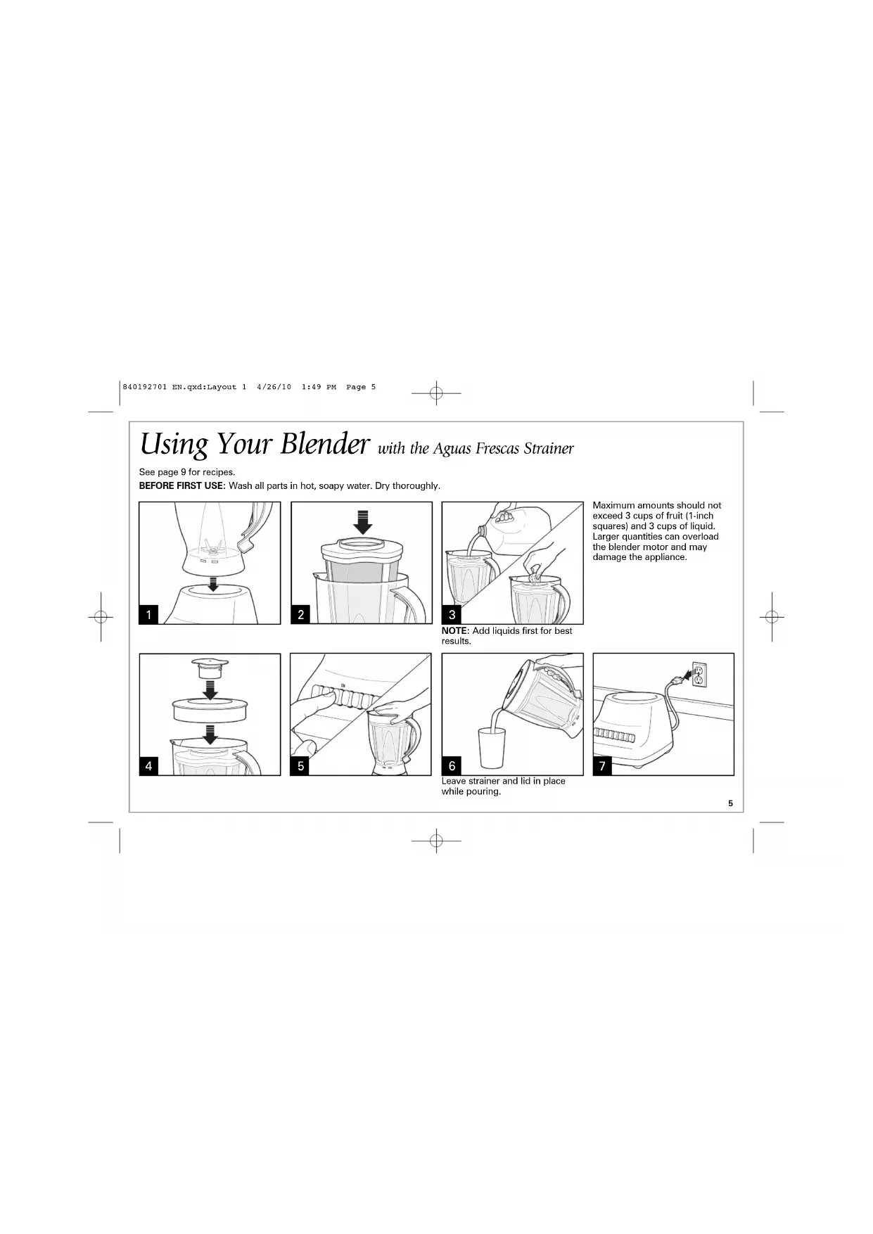 This appliance is intended for household use only. Use for food or liquids only. WARNING! Shock Hazard: This appliance has a polarized plug (one wide blade) that reduces the risk of electric shock. The plug fits only one way into a polarized outlet. Do not defeat the safety purpose of the plug by modifying the plug in any way or by using an adapter. If the plug does not fit, reverse the plug. If it still does not fit, have an electrician replace the outlet. The length of the cord used on this appliance was selected to reduce the hazards of becoming tangled in, or tripping over, a longer cord. If a longer cord is necessary, an approved extension cord may be used. The electrical rating of the extension cord must be equal to or greater than the rating of the blender. Care must be taken to arrange the extension cord so that it will not drape over the countertop or tabletop where it can be pulled on by children or accidentally tripped over. Do not place blender jar in the freezer filled with food or liquid. The contents may freeze and may result in damage to the cutting blades, jar, blender, and possibly result in personal injury. If cutting blades lock and do not move, it will damage the motor. Do not use. Call the toll-free customer service number for information. The wattage/ampere rating of the blender is determined by an Underwriters Laboratory test. These tests are based on available cutting blades and jar combinations that may not be provided with your unit. This is a measure of input wattage/amperes after 30 seconds of operation. Peak power is the measure of the motor wattage during the first seconds of operation. This is when a blender requires the most power to crush ice, frozen fruit, etc. This is a better measure of what a blender motor can consume when power is needed most. The blender as provided may draw significantly less power. Wattage/Peak Power Information 840192701 EN.qxd:Layout 1 4/26/10 1:49 PM Page 34 Parts and Features Filler Cap Lid Strainer Assembly Plastic Jar With Nonremovable Cutting Blades Control Panel Base Dishwasher Drain Holes 840192701 EN.qxd:Layout 1 4/26/10 1:49 PM Page 45 Using Your Blender with the Aguas Frescas Strainer See page 9 for recipes. BEFORE FIRST USE: Wash all parts in hot, soapy water. Dry thoroughly.
