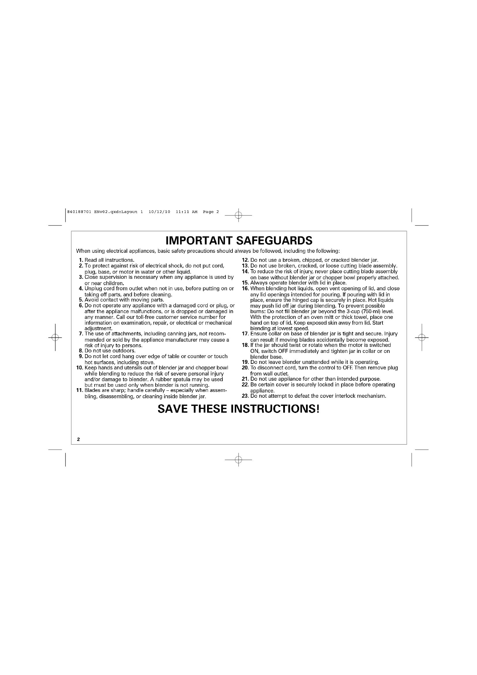 When using electrical appliances, basic safety precautions should always be followed, including the following: SAVE THESE INSTRUCTIONS! 840188701 ENv02.qxd:Layout 1 10/12/10 11:11 AM Page 23