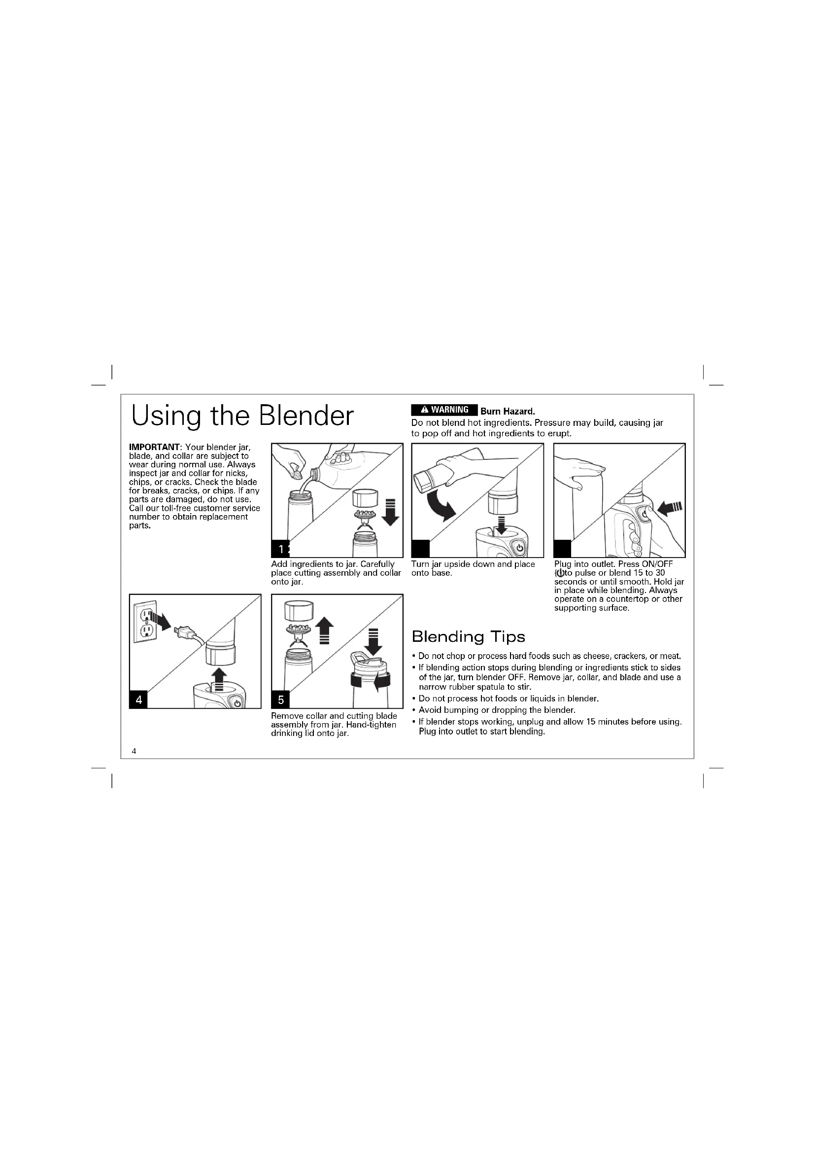 Plug into outlet. Press ON/OFF ( ) to pulse or blend 15 to 30 seconds or until smooth. Hold jar in place while blending. Always operate on a countertop or other supporting surface. Add ingredients to jar. Carefully place cutting assembly and collar onto jar. IMPORTANT: Your blender jar, blade, and collar are subject to wear during normal use. Always inspect jar and collar for nicks, chips, or cracks. Check the blade for breaks, cracks, or chips. If any parts are damaged, do not use. Call our toll-free customer service number to obtain replacement parts. Turn jar upside down and place onto base. Remove collar and cutting blade assembly from jar. Hand-tighten drinking lid onto jar. Blending Tips