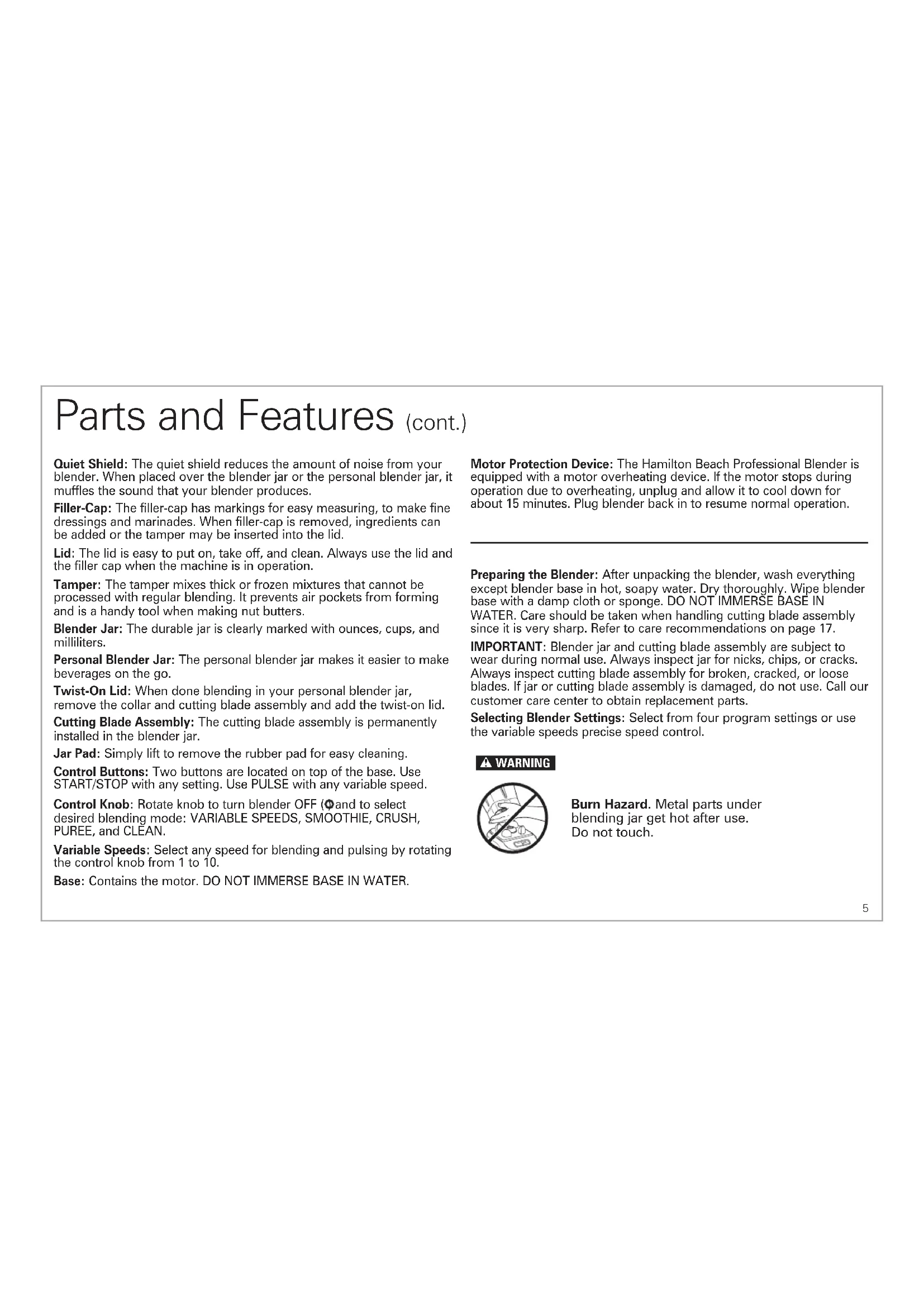 be ejected out of the appliance due to a sudden steaming.4 Blender Jar Parts and Features BEFORE FIRST USE: After unpacking the blender, follow the instructions in “Cleaning Your Blender.” Base Lid Filler-Cap Tamper To order parts: US: 1.800.851.8900 www.hamiltonbeach.com Canada: 1.800.267.2826 Mexico: 800 71 16 100 Control Panel OFF ( ) Quiet Shield* Cutting Blade Assembly Jar Pad PULSE Button START/STOP Button Control Knob Variable Speeds Personal Blender Jar Removable Collar Removable Cutting Blade Assembly Twist- On Lid Personal Blender Jar (optional accessory on select models)5 Parts and Features (cont.) Quiet Shield: The quiet shield reduces the amount of noise from your blender. When placed over the blender jar or the personal blender jar, it muffles the sound that your blender produces. Filler-Cap: The filler-cap has markings for easy measuring, to make fine dressings and marinades. When filler-cap is removed, ingredients can be added or the tamper may be inserted into the lid. Lid: The lid is easy to put on, take off, and clean. Always use the lid and the filler cap when the machine is in operation. Tamper: The tamper mixes thick or frozen mixtures that cannot be processed with regular blending. It prevents air pockets from forming and is a handy tool when making nut butters. Blender Jar: The durable jar is clearly marked with ounces, cups, and milliliters. Personal Blender Jar: The personal blender jar makes it easier to make beverages on the go. Twist-On Lid: When done blending in your personal blender jar, remove the collar and cutting blade assembly and add the twist-on lid. Cutting Blade Assembly: The cutting blade assembly is permanently installed in the blender jar. Jar Pad: Simply lift to remove the rubber pad for easy cleaning. Control Buttons: Two buttons are located on top of the base. Use START/STOP with any setting. Use PULSE with any variable speed. Control Knob: Rotate knob to turn blender OFF ( ) and to select desired blending mode: VARIABLE SPEEDS, SMOOTHIE, CRUSH, PUREE, and CLEAN. Variable Speeds: Select any speed for blending and pulsing by rotating the control knob from 1 to 10. Base: Contains the motor. DO NOT IMMERSE BASE IN WATER. Motor Protection Device: The Hamilton Beach Professional Blender is equipped with a motor overheating device. If the motor stops during operation due to overheating, unplug and allow it to cool down for about 15 minutes. Plug blender back in to resume normal operation. Preparing the Blender: After unpacking the blender, wash everything except blender base in hot, soapy water. Dry thoroughly. Wipe blender base with a damp cloth or sponge. DO NOT IMMERSE BASE IN WATER. Care should be taken when handling cutting blade assembly since it is very sharp. Refer to care recommendations on page 17. IMPORTANT: Blender jar and cutting blade assembly are subject to wear during normal use. Always inspect jar for nicks, chips, or cracks. Always inspect cutting blade assembly for broken, cracked, or loose blades. If jar or cutting blade assembly is damaged, do not use. Call our customer care center to obtain replacement parts. Selecting Blender Settings: Select from four program settings or use the variable speeds precise speed control. w WARNING PULSESTART STOP Burn Hazard. Metal parts under blending jar get hot after use. Do not touch.6 Using Program Settings Programs are optimized for recipe categories and vary in blending speed and duration. The blender automatically stops at the end of the program. Some recipes may require more or less blending time.