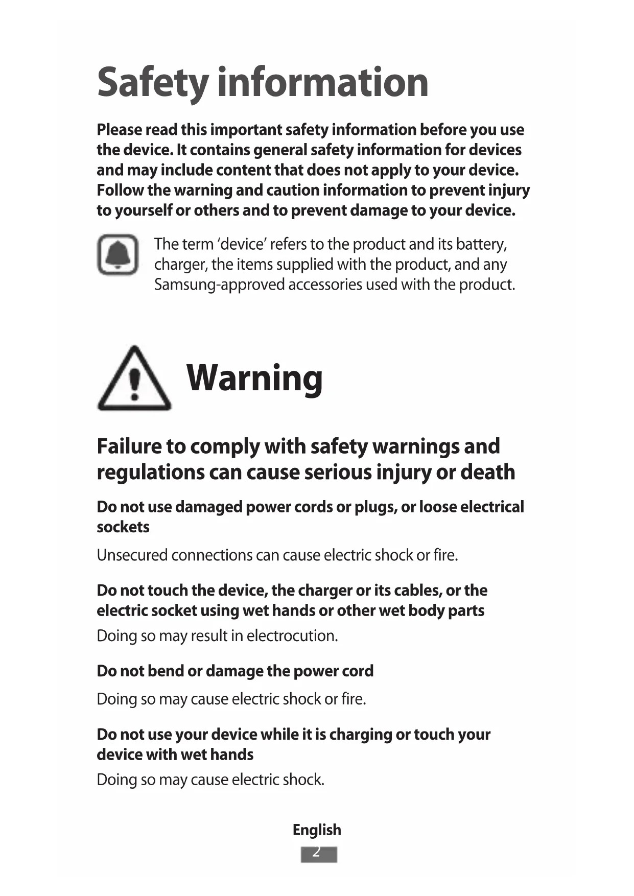 Safety information Please read this important safety information before you use the device. It contains general safety information for devices and may include content that does not apply to your device. Follow the warning and caution information to prevent injury to yourself or others and to prevent damage to your device. The term ‘device’ refers to the product and its battery, charger, the items supplied with the product, and any Samsung-approved accessories used with the product. Warning Failure to comply with safety warnings and regulations can cause serious injury or death Do not use damaged power cords or plugs, or loose electrical sockets Unsecured connections can cause electric shock or fire. Do not touch the device, the charger or its cables, or the electric socket using wet hands or other wet body parts Doing so may result in electrocution. Do not bend or damage the power cord Doing so may cause electric shock or fire. Do not use your device while it is charging or touch your device with wet hands Doing so may cause electric shock.English