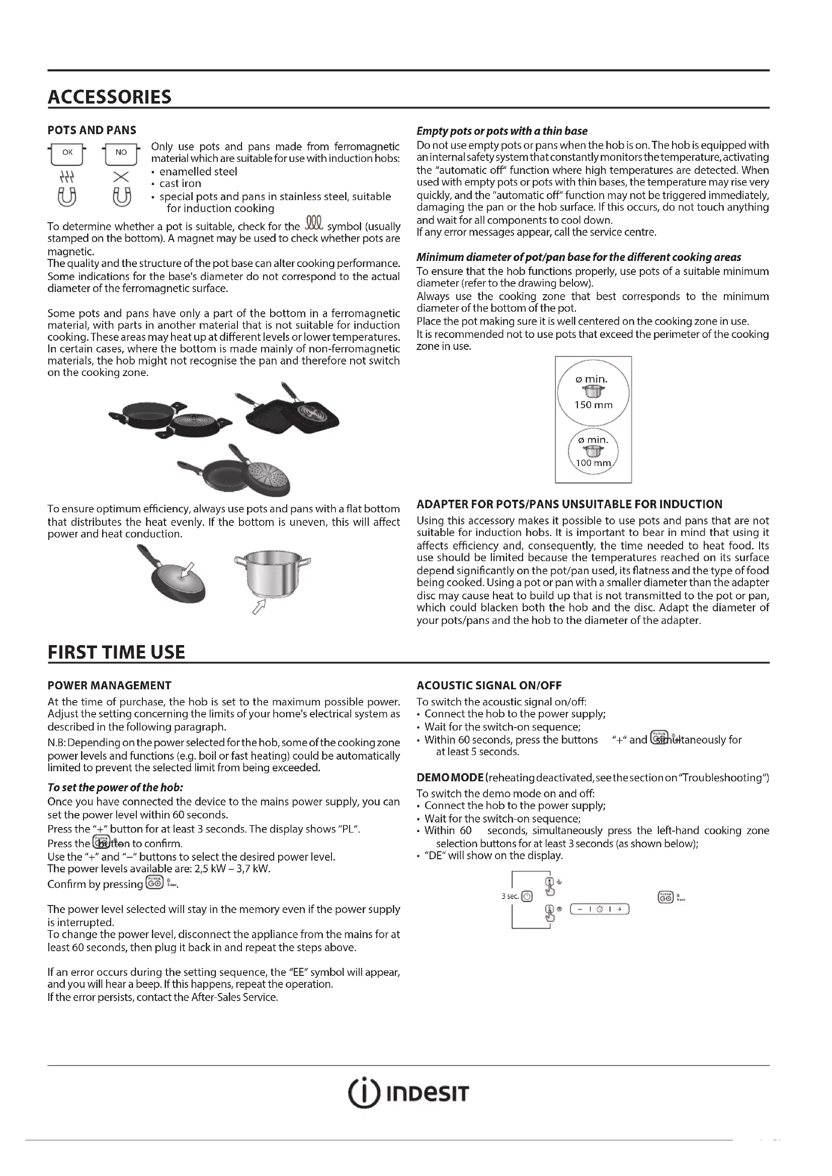 - special pots and pans in stainless steel, suitable for induction cooking To determine whether a pot is suitable, check for the symbol (usually stamped on the bottom). A magnet may be used to check whether pots are magnetic. The quality and the structure of the pot base can alter cooking performance. Some indications for the base's diameter do not correspond to the actual diameter of the ferromagnetic surface. Some pots and pans have only a part of the bottom in a ferromagnetic material, with parts in another material that is not suitable for induction cooking. These areas may heat up at dierent levels or lower temperatures. In certain cases, where the bottom is made mainly of non-ferromagnetic materials, the hob might not recognise the pan and therefore not switch on the cooking zone. To ensure optimum eciency, always use pots and pans with a at bottom that distributes the heat evenly. If the bottom is uneven, this will aect power and heat conduction. NOOK Empty pots or pots with a thin base Do not use empty pots or pans when the hob is on. The hob is equipped with an internal safety system that constantly monitors the temperature, activating the “automatic o“ function where high temperatures are detected. When used with empty pots or pots with thin bases, the temperature may rise very quickly, and the “automatic o“ function may not be triggered immediately, damaging the pan or the hob surface. If this occurs, do not touch anything and wait for all components to cool down. If any error messages appear, call the service centre. Minimum diameter of pot/pan base for the dierent cooking areas To ensure that the hob functions properly, use pots of a suitable minimum diameter (refer to the drawing below). Always use the cooking zone that best corresponds to the minimum diameter of the bottom of the pot. Place the pot making sure it is well centered on the cooking zone in use. It is recommended not to use pots that exceed the perimeter of the cooking zone in use. ø min. 100 mm ø min. 150 mm ADAPTER FOR POTS/PANS UNSUITABLE FOR INDUCTION Using this accessory makes it possible to use pots and pans that are not suitable for induction hobs. It is important to bear in mind that using it aects eciency and, consequently, the time needed to heat food. Its use should be limited because the temperatures reached on its surface depend signicantly on the pot/pan used, its atness and the type of food being cooked. Using a pot or pan with a smaller diameter than the adapter disc may cause heat to build up that is not transmitted to the pot or pan, which could blacken both the hob and the disc. Adapt the diameter of your pots/pans and the hob to the diameter of the adapter.DAILY USE