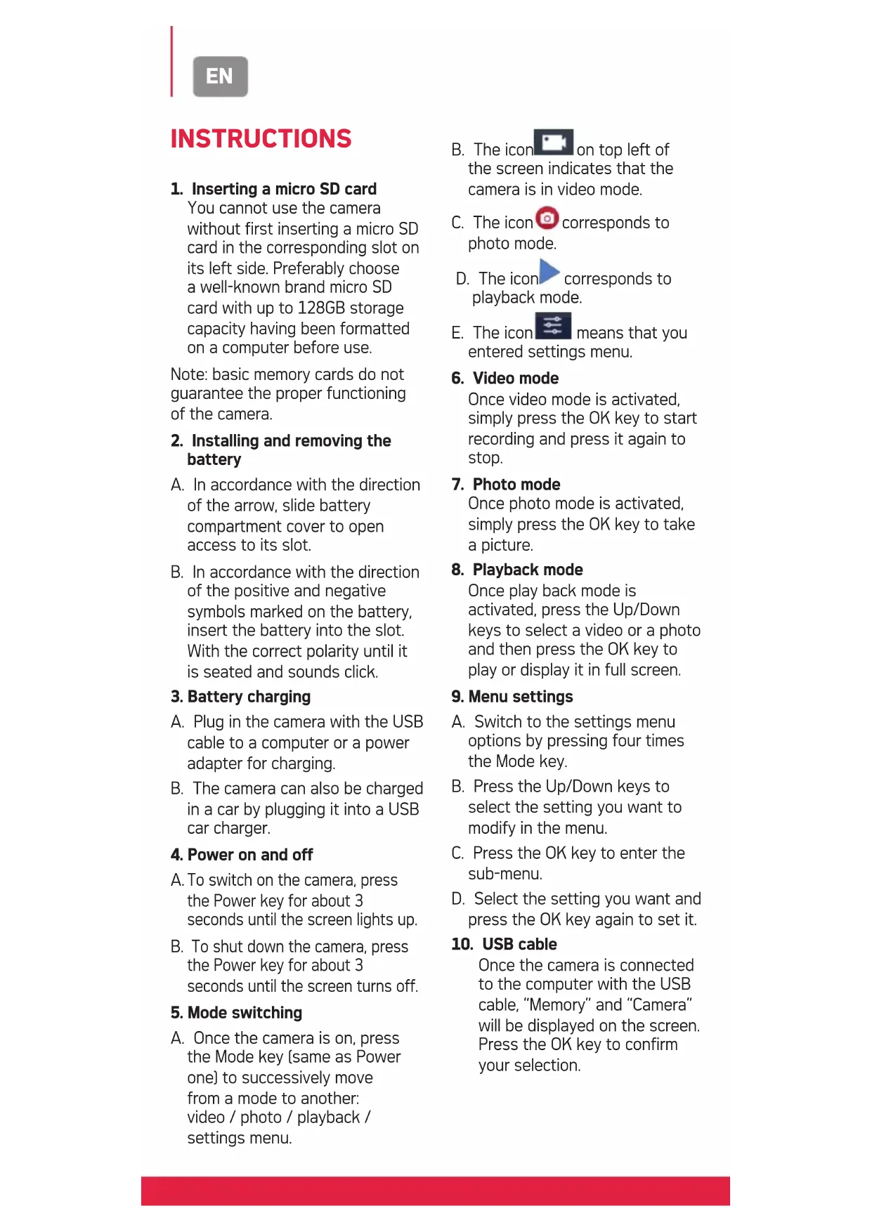 A. Once the camera is on, press the Mode key (same as Power one) to successively move from a mode to another: video / photo / playback / settings menu. B. The icon on top left of the screen indicates that the camera is in video mode. C. The icon corresponds to photo mode. D. The icon corresponds to playback mode. E. The icon means that you entered settings menu.