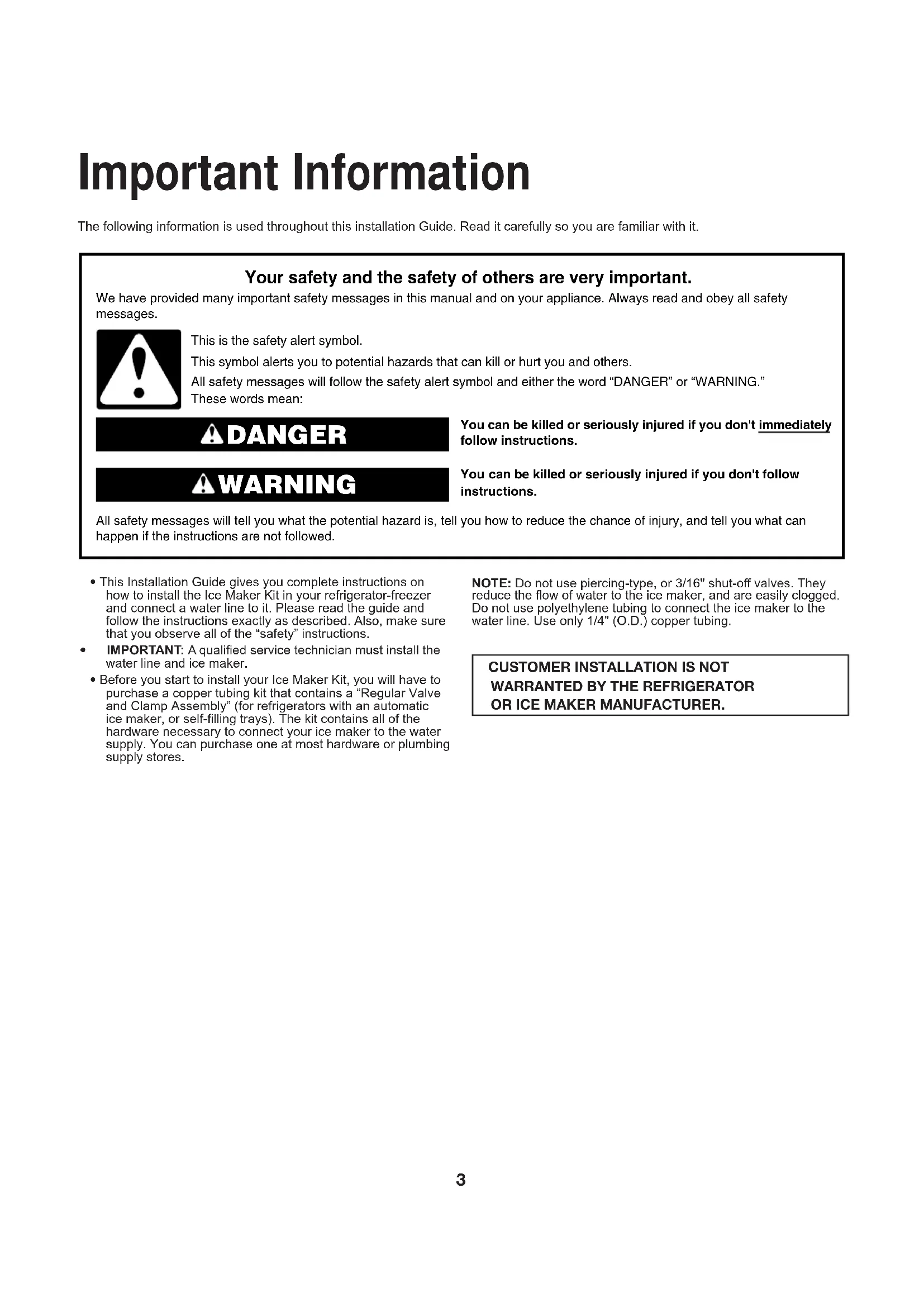 - IMPORTANT: A qualied service technician must install the water line and ice maker. • Before you start to install your Ice Maker Kit, you will have to purchase a copper tubing kit that contains a “Regular Valve and Clamp Assembly” (for refrigerators with an automatic ice maker, or self-lling trays). The kit contains all of the hardware necessary to connect your ice maker to the water supply. You can purchase one at most hardware or plumbing supply stores.NOTE: Do not use piercing-type, or 3/16" shut-o valves. They reduce the ow of water to the ice maker, and are easily clogged. Do not use polyethylene tubing to connect the ice maker to the water line. Use only 1/4" (O.D.) copper tubing.