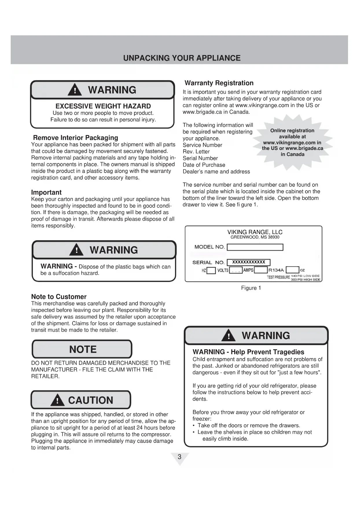 Use two or more people to move product.Failure to do so can result in personal injury. Remove Interior Packaging Your appliance has been packed for shipment with all parts that could be damaged by movement securely fastened. Remove internal packing materials and any tape holding in-ternal components in place. The owners manual is shipped inside the product in a plastic bag along with the warranty registration card, and other accessory items. Important Keep your carton and packaging until your appliance has been thoroughly inspected and found to be in good condi-tion. If there is damage, the packaging will be needed as proof of damage in transit. Afterwards please dispose of all items responsibly. Note to Customer This merchandise was carefully packed and thoroughly inspected before leaving our plant. Responsibility for its safe delivery was assumed by the retailer upon acceptance of the shipment. Claims for loss or damage sustained in transit must be made to the retailer.DO NOT RETURN DAMAGED MERCHANDISE TO THE MANUFACTURER - FILE THE CLAIM WITH THE RETAILER.If the appliance was shipped, handled, or stored in other than an upright position for any period of time, allow the ap-pliance to sit upright for a period of at least 24 hours before plugging in. This will assure oil returns to the compressor. Plugging the appliance in immediately may cause damage to internal parts.It is important you send in your warranty registration card immediately after taking delivery of your appliance or you can register online at www.vikingrange.com in the US or www.brigade.ca in Canada. The following information will be required when registering your appliance.Service NumberRev. LetterSerial NumberDate of PurchaseDealer’s name and addressThe service number and serial number can be found on the serial plate which is located inside the cabinet on the bottom of the liner toward the left side. Open the bottom drawer to view it. See fi gure 1. Warranty Registration Online registration available at www.vikingrange.com in the US or www.brigade.ca in CanadaFigure 1