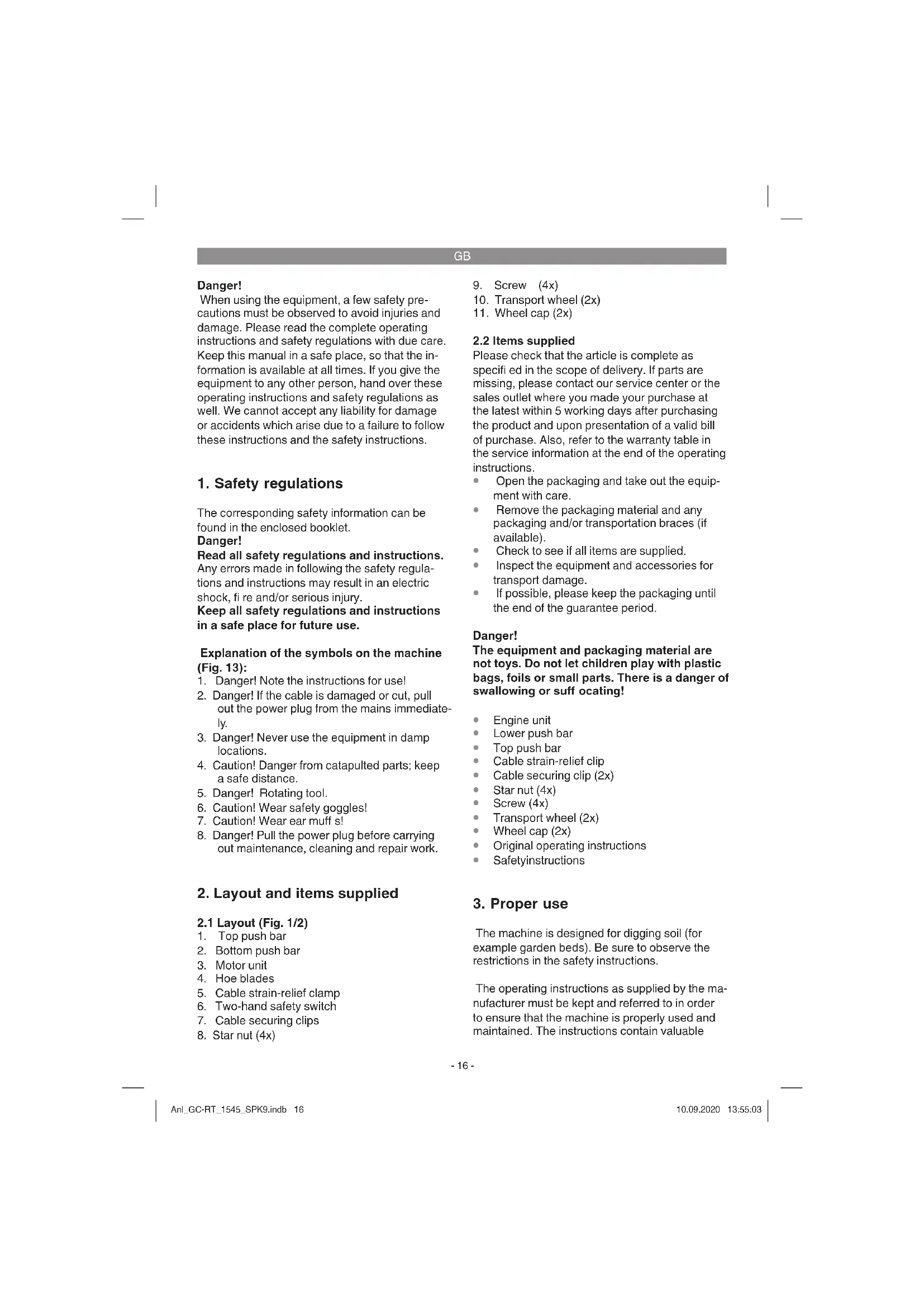 The machine is designed for digging soil (for example garden beds). Be sure to observe the restrictions in the safety instructions. The operating instructions as supplied by the ma- nufacturer must be kept and referred to in order to ensure that the machine is properly used and maintained. The instructions contain valuable Anl_GC-RT_1545_SPK9.indb 16Anl_GC-RT_1545_SPK9.indb 16 10.09.2020 13:55:0310.09.2020 13:55:03GB