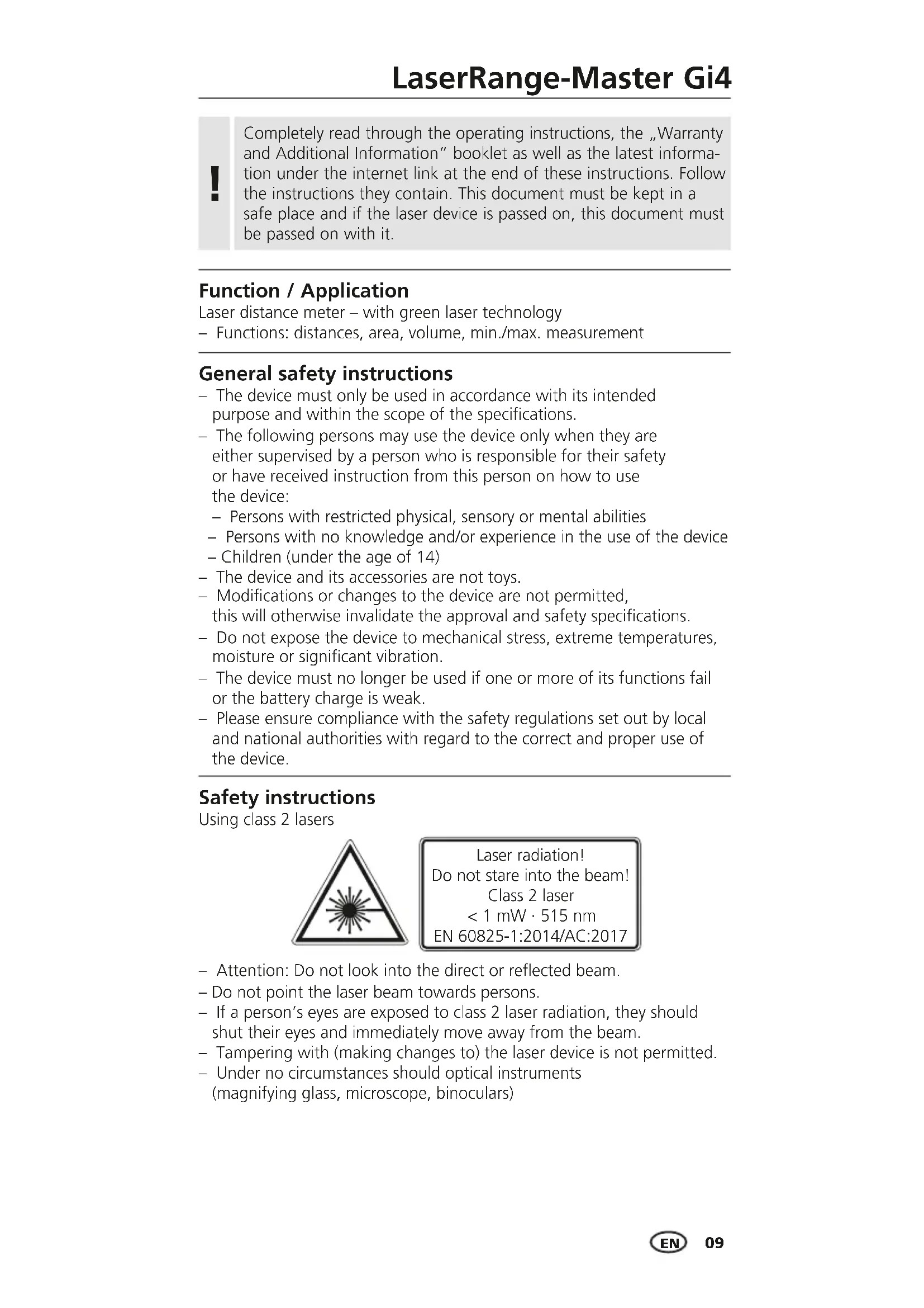 General safety instructions – The device must only be used in accordance with its intended purpose and within the scope of the specications. – The following persons may use the device only when they are either supervised by a person who is responsible for their safety or have received instruction from this person on how to use the device: – Persons with restricted physical, sensory or mental abilities – Persons with no knowledge and/or experience in the use of the device – Children (under the age of 14) – The device and its accessories are not toys. – Modications or changes to the device are not permitted, this will otherwise invalidate the approval and safety specications. – Do not expose the device to mechanical stress, extreme temperatures, moisture or signicant vibration. – The device must no longer be used if one or more of its functions fail or the battery charge is weak. – Please ensure compliance with the safety regulations set out by local and national authorities with regard to the correct and proper use of the device. – Attention: Do not look into the direct or reected beam. – Do not point the laser beam towards persons. – If a person‘s eyes are exposed to class 2 laser radiation, they should shut their eyes and immediately move away from the beam. – Tampering with (making changes to) the laser device is not permitted. – Under no circumstances should optical instruments (magnifying glass, microscope, binoculars) Safety instructions Using class 2 lasers Laser radiation! Do not stare into the beam! Class 2 laser < 1 mW · 515 nm EN 60825-1:2014/AC:2017 Laser distance meter – with green laser technology – Functions: distances, area, volume, min./max. measurement10