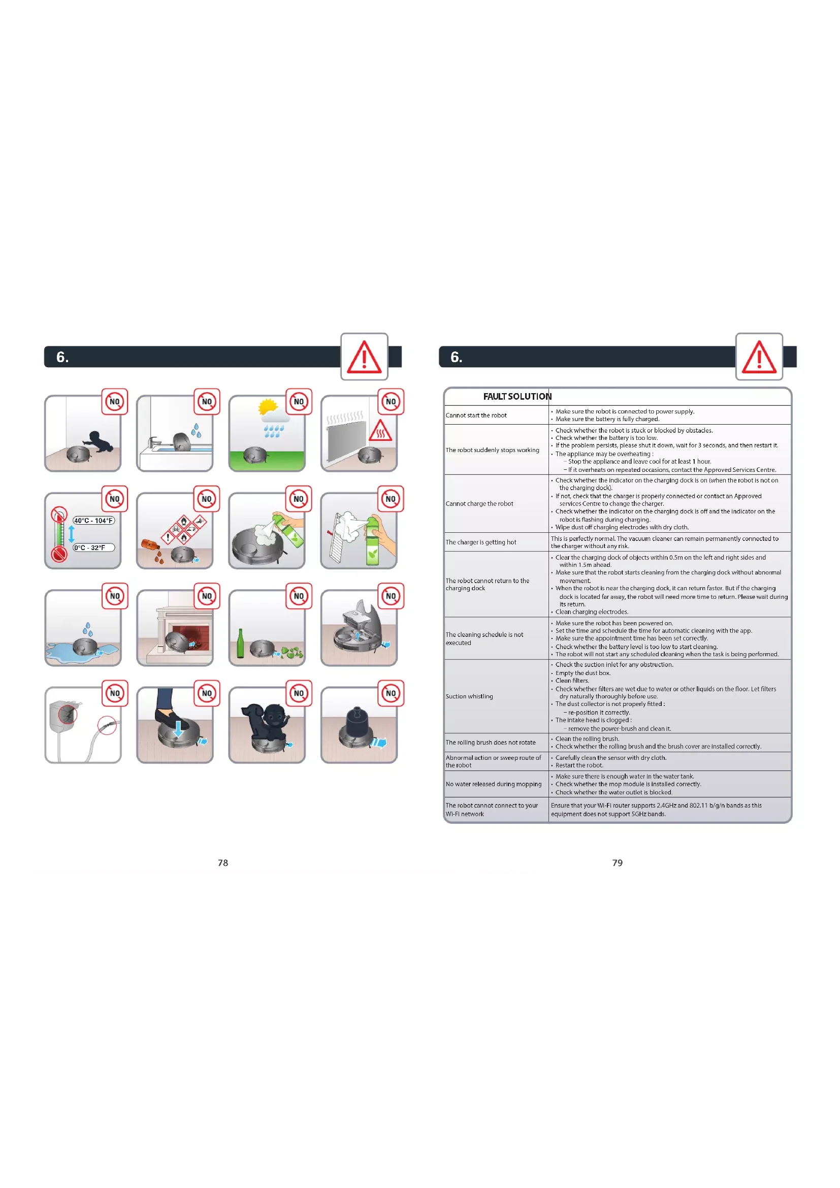 Error W1: Battery abnormal. Please consult the instructions or APP. Please open the battery compartment, check whether the battery is properly connected, and try to restart the robot. The battery temperature is too high or too low. Please wait for the battery temperature to be normal (0°С~40°С/32°F~104°F) before use. If the error persists, please contact our Service Department. Error W2: Wheel module abnormal. Please consult the instructions or APP. Please check whether any foreign matter is stuck in a wheel and try to restart the robot. If the error persists, please contact our Service Department. Error W3: Side brush module abnormal. Please consult the instructions or APP. Please check whether any foreign matter is stuck in a side brush and try to restart the robot. If the error persists, please contact our Service Department. Error W4: Rolling brush abnormal. Please consult the instructions or APP. Please remove and clean it, its connections, its cover and the suction inlet. Please try to restart the robot after cleaning. If the error persists, please contact our Service Department. *Error W5: Water pump abnormal. Please consult the instructions or APP. Please clean the water tank, water pump connections on the tank and water pump connections on the robot, the water outlet at the robot bottom, and check the mop module. Please try to restart the robot with all modules installed back after cleaning. If the error persists, please contact our Service Department. Error W6: Laser sensor abnormal. Please consult the instructions or APP. Please check the laser sensor for foreign matter and try to restart the robot after cleaning. If the error persists, please contact our Service Department. Error W7: Fan abnormal. Please consult the instructions or APP. Please check whether any foreign matter is stuck in the fan and try to restart the robot. Please clean the dust box and filters and try to restart the robot. If the error persists, please contact our Service Department.82 83
