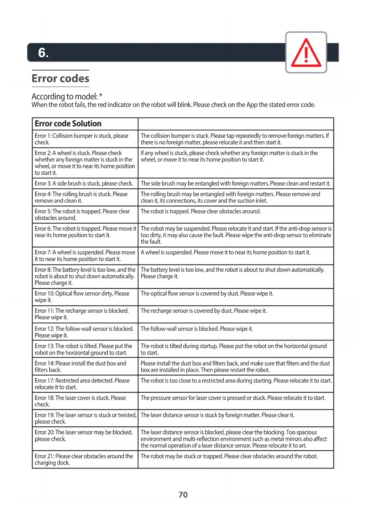 Error codes According to model: * When the robot fails, the red indicator on the robot will blink. Please check on the App the stated error code. Error code Solution Error 1: Collision bumper is stuck, please check.The collision bumper is stuck. Please tap repeatedly to remove foreign matters. If there is no foreign matter, please relocate it and then start it.Error 2: A wheel is stuck. Please check whether any foreign matter is stuck in the wheel, or move it to near its home position to start it.If any wheel is stuck, please check whether any foreign matter is stuck in the wheel, or move it to near its home position to start it. Error 3: A side brush is stuck, please check. The side brush may be entangled with foreign matters. Please clean and restart it. Error 4: The rolling brush is stuck. Please remove and clean it.The rolling brush may be entangled with foreign matters. Please remove and clean it, its connections, its cover and the suction inlet.Error 5: The robot is trapped. Please clear obstacles around.The robot is trapped. Please clear obstacles around.Error 6: The robot is trapped. Please move it near its home position to start it.The robot may be suspended. Please relocate it and start. If the anti-drop sensor is too dirty, it may also cause the fault. Please wipe the anti-drop sensor to eliminate the fault.Error 7: A wheel is suspended. Please move it to near its home position to start it.A wheel is suspended. Please move it to near its home position to start it.Error 8: The battery level is too low, and the robot is about to shut down automatically. Please charge it.The battery level is too low, and the robot is about to shut down automatically. Please charge it.Error 10: Optical flow sensor dirty, Please wipe it.The optical flow sensor is covered by dust. Please wipe it.Error 11: The recharge sensor is blocked. Please wipe it.The recharge sensor is covered by dust. Please wipe it.Error 12: The follow-wall sensor is blocked. Please wipe it.The follow-wall sensor is blocked. Please wipe it.Error 13: The robot is tilted. Please put the robot on the horizontal ground to start.The robot is tilted during startup. Please put the robot on the horizontal ground to start.Error 14: Please install the dust box and filters back.Please install the dust box and filters back, and make sure that filters and the dust box are installed in place. Then please restart the robot.Error 17: Restricted area detected. Please relocate it to start.The robot is too close to a restricted area during starting. Please relocate it to start.Error 18: The laser cover is stuck. Please check.The pressure sensor for laser cover is pressed or stuck. Please relocate it to start.Error 19: The laser sensor is stuck or twisted, please check.The laser distance sensor is stuck by foreign matter. Please clear it.Error 20: The laser sensor may be blocked, please check.The laser distance sensor is blocked, please clear the blocking. Too spacious environment and multi-reflection environment such as metal mirrors also affect the normal operation of a laser distance sensor. Please relocate it to art.Error 21: Please clear obstacles around the charging dock.The robot may be stuck or trapped. Please clear obstacles around the robot.71