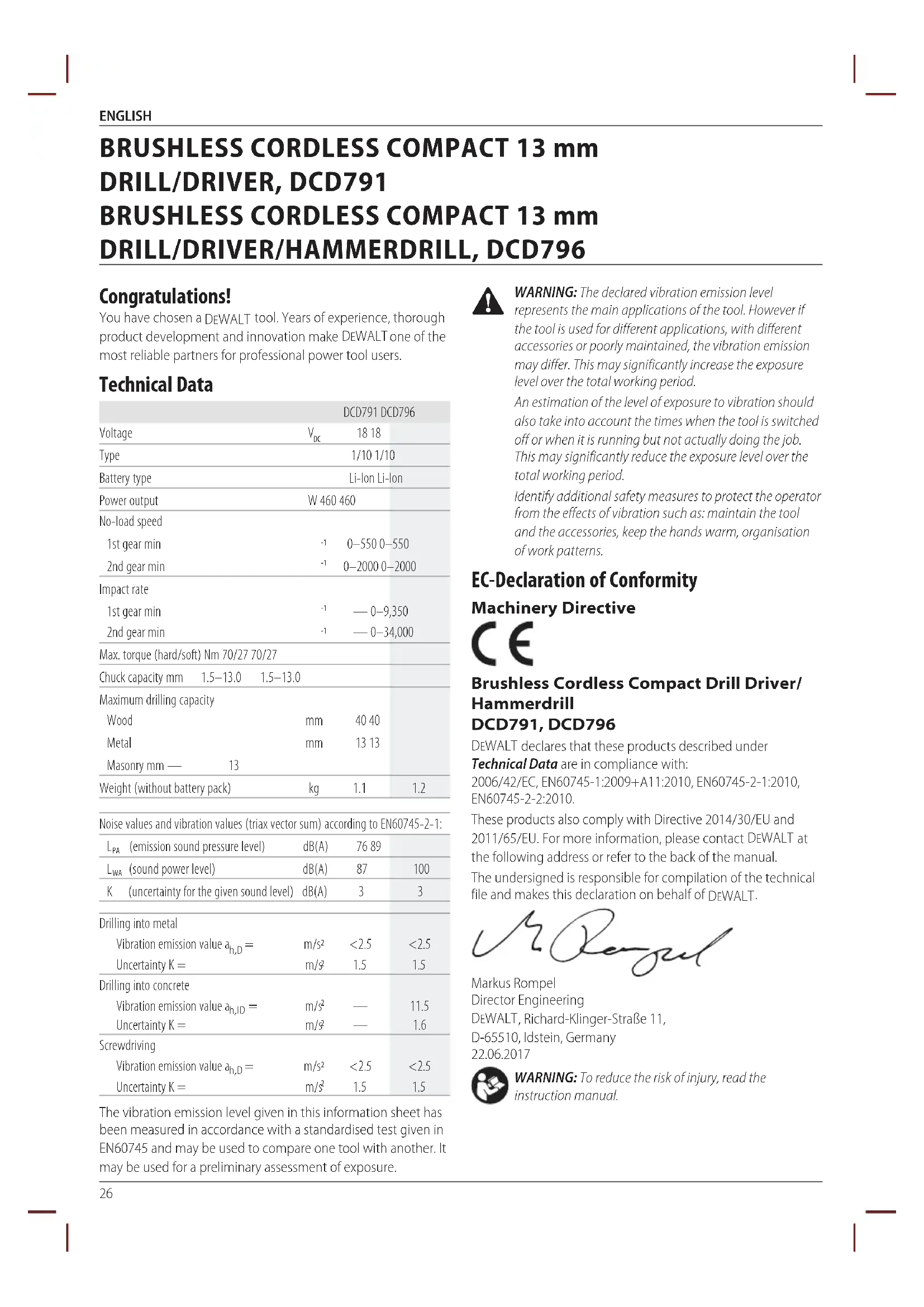 Congratulations! You have chosen a DEWALT tool. Years of experience, thorough product development and innovation make DEWALT one of the most reliable partners for professional power toolusers. Technical Data DCD791 DCD796 Voltage