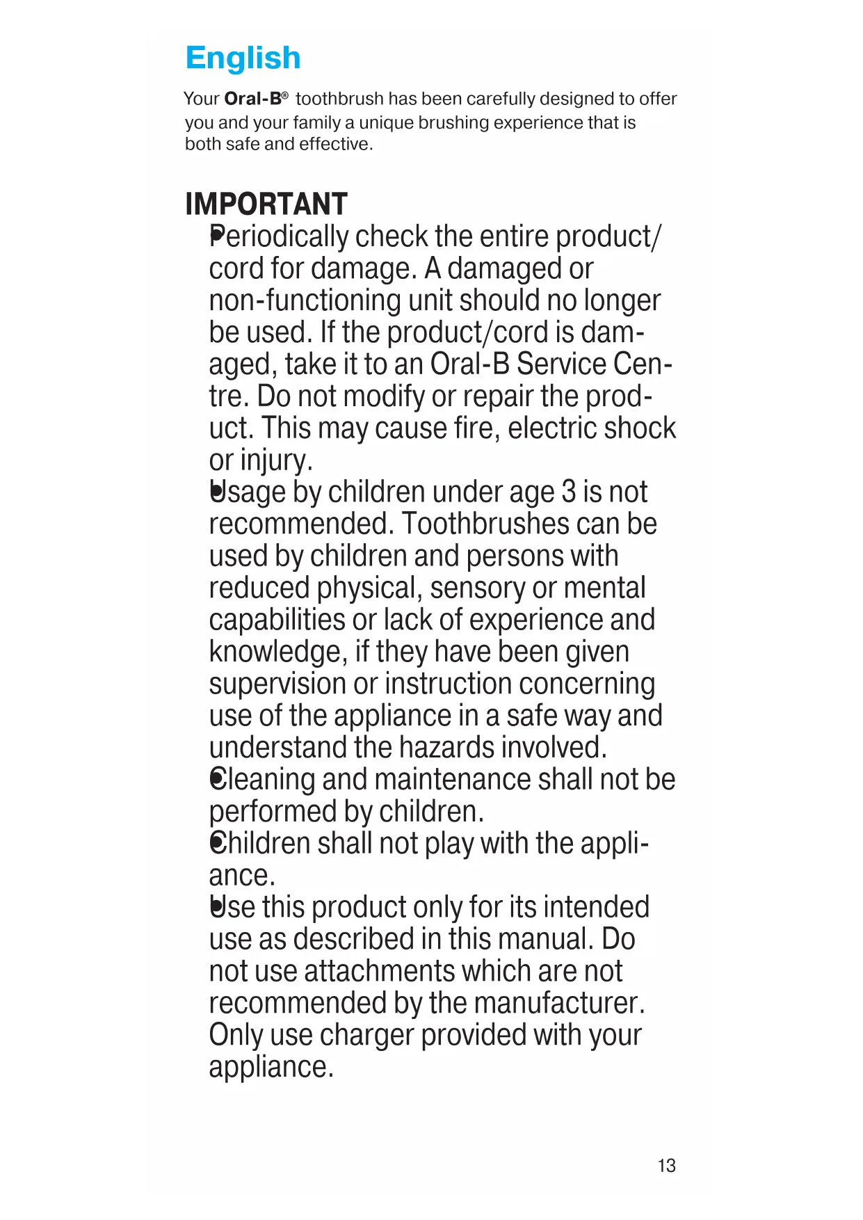 Periodically check the entire product/ cord for damage. A damaged or non-functioning unit should no longer be used. If the product/cord is dam- aged, take it to an Oral-B Service Cen- tre. Do not modify or repair the prod- uct. This may cause fire, electric shock or injury.