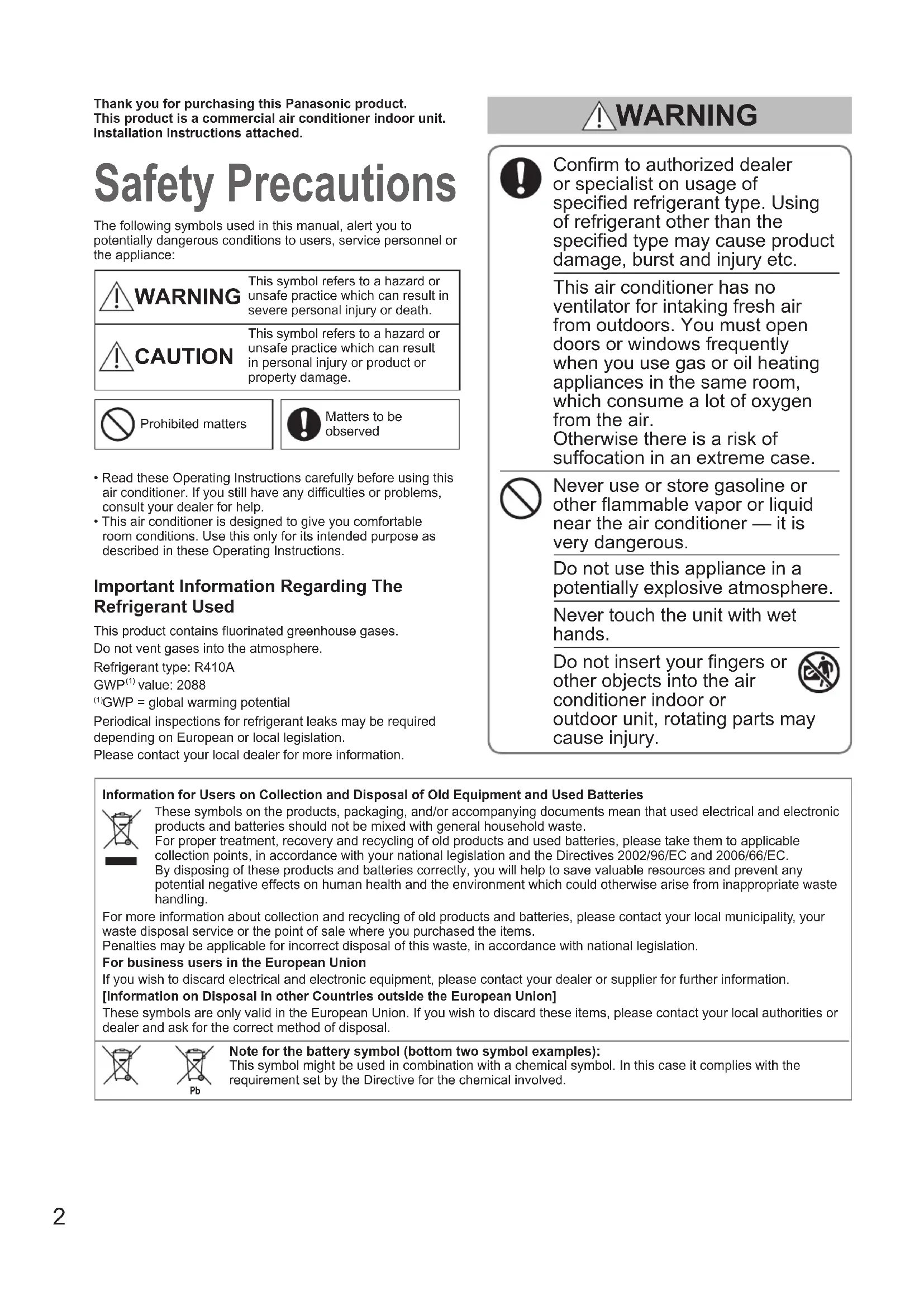 - Shows the standard installation 00_330578_All.indb 1 2021/4/8 10:04:052 Thank you for purchasing this Panasonic product.This product is a commercial air conditioner indoor unit.Installation Instructions attached. Safety Precautions The following symbols used in this manual, alert you to potentially dangerous conditions to users, service personnel or the appliance: WARNING This symbol refers to a hazard or unsafe practice which can result in severe personal injury or death. CAUTION This symbol refers to a hazard or unsafe practice which can result in personal injury or product or property damage.Prohibited mattersMatters to be observed• Read these Operating Instructions carefully before using this air conditioner. If you still have any difculties or problems, consult your dealer for help.• This air conditioner is designed to give you comfortable room conditions. Use this only for its intended purpose as described in these Operating Instructions. Conrm to authorized dealer or specialist on usage of specied refrigerant type. Using of refrigerant other than the specied type may cause product damage, burst and injury etc. This air conditioner has no ventilator for intaking fresh air from outdoors. You must open doors or windows frequently when you use gas or oil heating appliances in the same room, which consume a lot of oxygen from the air. Otherwise there is a risk of suffocation in an extreme case. Never use or store gasoline or other ammable vapor or liquid near the air conditioner — it is very dangerous. Do not use this appliance in a potentially explosive atmosphere. Never touch the unit with wet hands. Do not insert your ngers or other objects into the air conditioner indoor or outdoor unit, rotating parts may cause injury. WARNING Important Information Regarding The Refrigerant UsedThis product contains uorinated greenhouse gases. Do not vent gases into the atmosphere.Refrigerant type: R410A GWP (1) value: 2088 (1) GWP = global warming potentialPeriodical inspections for refrigerant leaks may be required depending on European or local legislation. Please contact your local dealer for more information.Information for Users on Collection and Disposal of Old Equipment and Used Batteries hese symbols on the products, packaging, and/or accompanying documents mean that used electrical and electronic products and batteries should not be mixed with general household waste.For proper treatment, recovery and recycling of old products and used batteries, please take them to applicable collection points, in accordance with your national legislation and the Directives 2002/96/EC and 2006/66/EC.By disposing of these products and batteries correctly, you will help to save valuable resources and prevent any potential negative effects on human health and the environment which could otherwise arise from inappropriate waste handling. For more information about collection and recycling of old products and batteries, please contact your local municipality, your waste disposal service or the point of sale where you purchased the items.Penalties may be applicable for incorrect disposal of this waste, in accordance with national legislation.For business users in the European Union If you wish to discard electrical and electronic equipment, please contact your dealer or supplier for further information. [Information on Disposal in other Countries outside the European Union] These symbols are only valid in the European Union. If you wish to discard these items, please contact your local authorities or dealer and ask for the correct method of disposal.