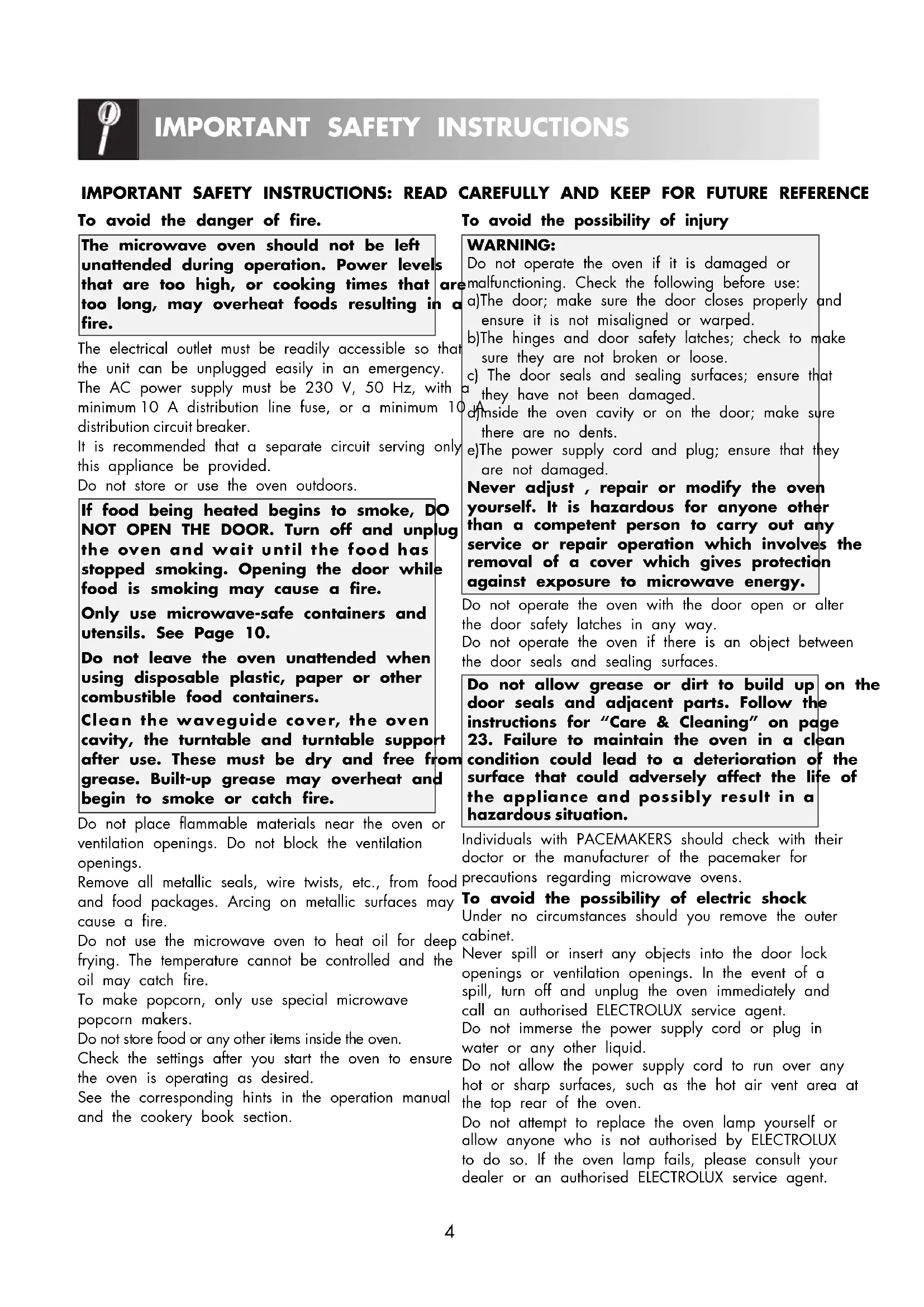 condition could lead to a deterioration of the surface that could adversely affect the life of the appliance and possibly result in a hazardous situation. Individuals with PACEMAKERS should check with their doctor or the manufacturer of the pacemaker for precautions regarding microwave ovens. To avoid the possibility of electric shock Under no circumstances should you remove the outer cabinet. Never spill or insert any objects into the door lock openings or ventilation openings. In the event of a spill, turn off and unplug the oven immediately and call an authorised ELECTROLUX service agent. Do not immerse the power supply cord or plug in water or any other liquid. Do not allow the power supply cord to run over any hot or sharp surfaces, such as the hot air vent area at the top rear of the oven. Do not attempt to replace the oven lamp yourself or allow anyone who is not authorised by ELECTROLUX to do so. If the oven lamp fails, please consult your dealer or an authorised ELECTROLUX service agent. To avoid the danger of fire. The microwave oven should not be left unattended during operation. Power levels that are too high, or cooking times that are too long, may overheat foods resulting in a fire. The electrical outlet must be readily accessible so that the unit can be unplugged easily in an emergency. The AC power supply must be 230 V, 50 Hz, with a minimum 10 A distribution line fuse, or a minimum 10 A distribution circuit breaker. It is recommended that a separate circuit serving only this appliance be provided. Do not store or use the oven outdoors. If food being heated begins to smoke, DO NOT OPEN THE DOOR. Turn off and unplug the oven and wait until the food has stopped smoking. Opening the door while food is smoking may cause a fire. Only use microwave-safe containers and utensils. See Page 10. Do not leave the oven unattended when using disposable plastic, paper or other combustible food containers. Clean the waveguide cover, the oven cavity, the turntable and turntable support after use. These must be dry and free from grease. Built-up grease may overheat and begin to smoke or catch fire. Do not place flammable materials near the oven or ventilation openings. Do not block the ventilation openings. Remove all metallic seals, wire twists, etc., from food and food packages. Arcing on metallic surfaces may cause a fire. Do not use the microwave oven to heat oil for deep frying. The temperature cannot be controlled and the oil may catch fire. To make popcorn, only use special microwave popcorn makers. Do not store food or any other items inside the oven. Check the settings after you start the oven to ensure the oven is operating as desired. See the corresponding hints in the operation manual and the cookery book section.ENGLISH