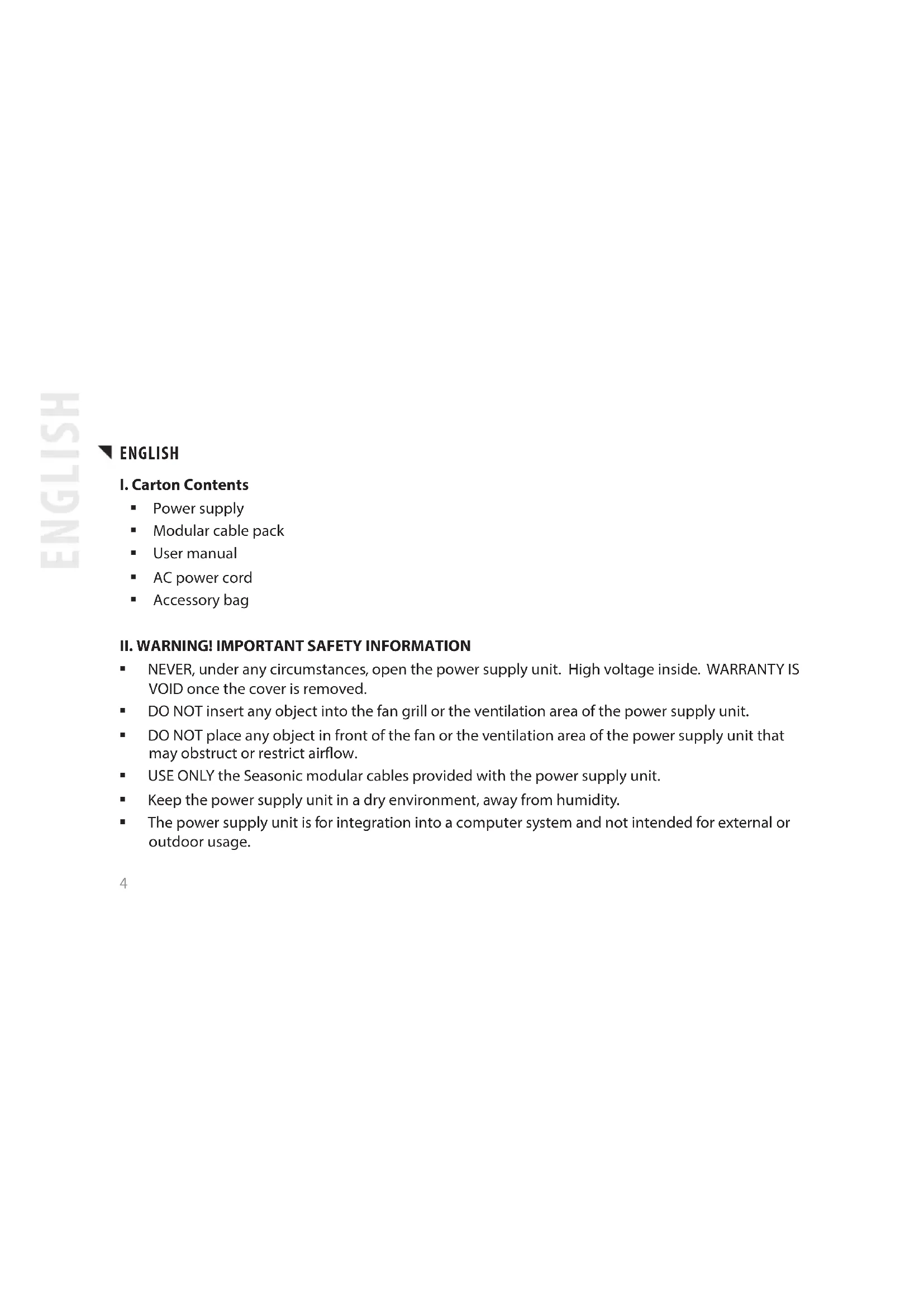 NEVER, under any circumstances, open the power supply unit. High voltage inside. WARRANTY IS VOID once the cover is removed. DO NOT insert any object into the fan grill or the ventilation area of the power supply unit. DO NOT place any object in front of the fan or the ventilation area of the power supply unit that may obstruct or restrict airow. USE ONLY the Seasonic modular cables provided with the power supply unit. Keep the power supply unit in a dry environment, away from humidity. The power supply unit is for integration into a computer system and not intended for external or outdoor usage. ENGLISH ENGLISH5
