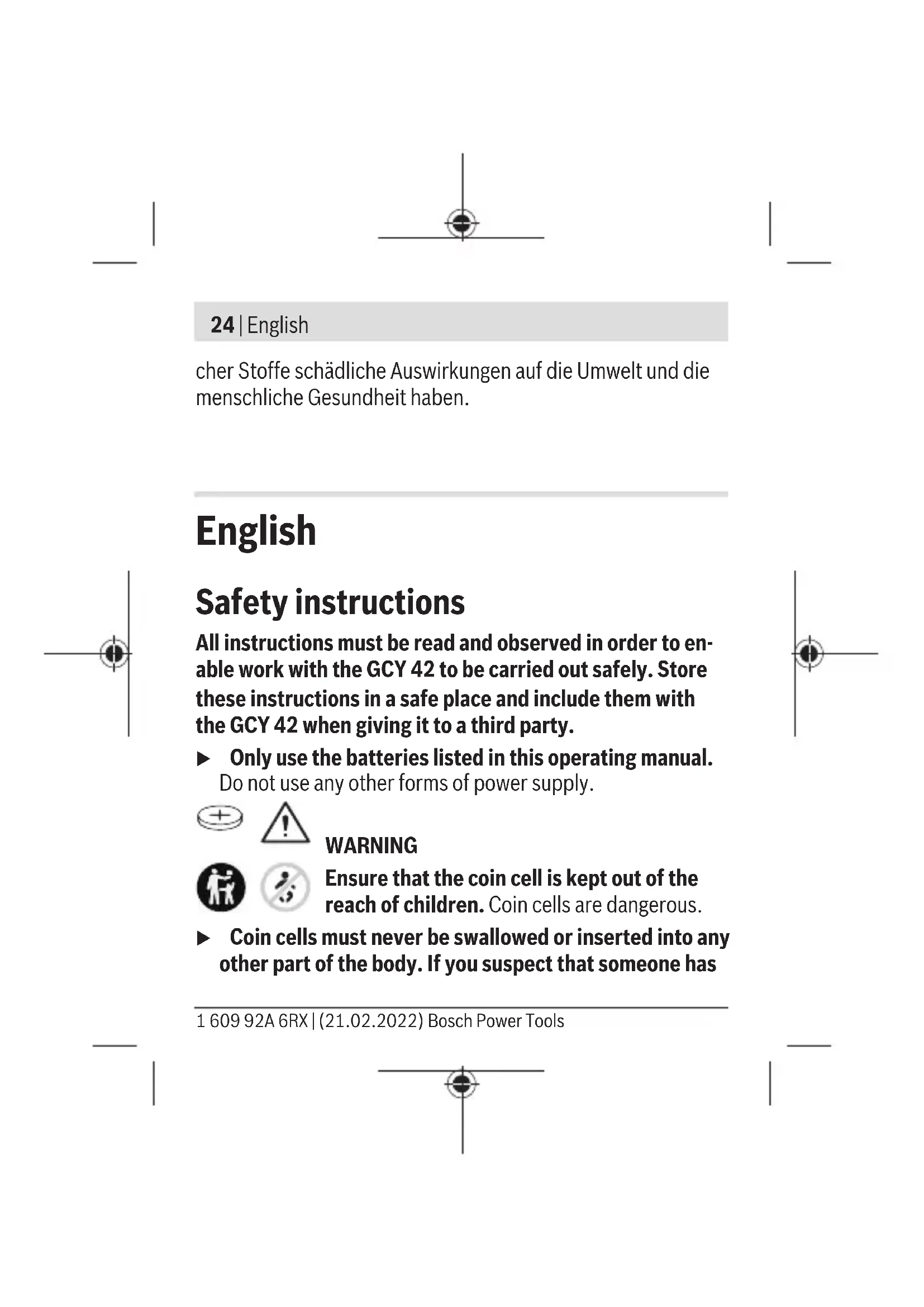 Accessories shown or described are not included with the product as standard. You can find the complete selection of accessories in our accessories range. Technical Data Bluetooth ® Low Energy Module GCY 42 Article number 1600A01ZE2 1600A013WF Bosch Power Tools 1 609 92A 6RX | (21.02.2022)28 | English Bluetooth ® Low Energy Module GCY 42 1600A016NH 1600A01L2W Operating temperature –20°C to +50°C Storage temperature –20°C to +70°C Dimensions 7x30x30mm Weight according to EPTA- Procedure01:2014 0.01kg Data transfer Bluetooth® Bluetooth® 4.2 (Low Energy)
