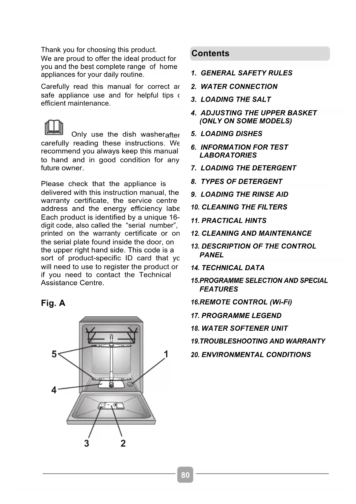 Thank you for choosing this product. We are proud to offer the ideal product for you and the best complete range of home appliances for your daily routine. Carefully read this manual for correct and safe appliance use and for helpful tips on efficient maintenance. Only use the dish washer after carefully reading these instructions. We recommend you always keep this manual to hand and in good condition for any future owner. Please check that the appliance is delivered with this instruction manual, the warranty certificate, the service centre address and the energy efficiency label. Each product is identified by a unique 16- digit code, also called the “serial number”, printed on the warranty certificate or on the serial plate found inside the door, on the upper right hand side. This code is a sort of product-specific ID card that you will need to use to register the product or if you need to contact the Technical Assistance Centre.