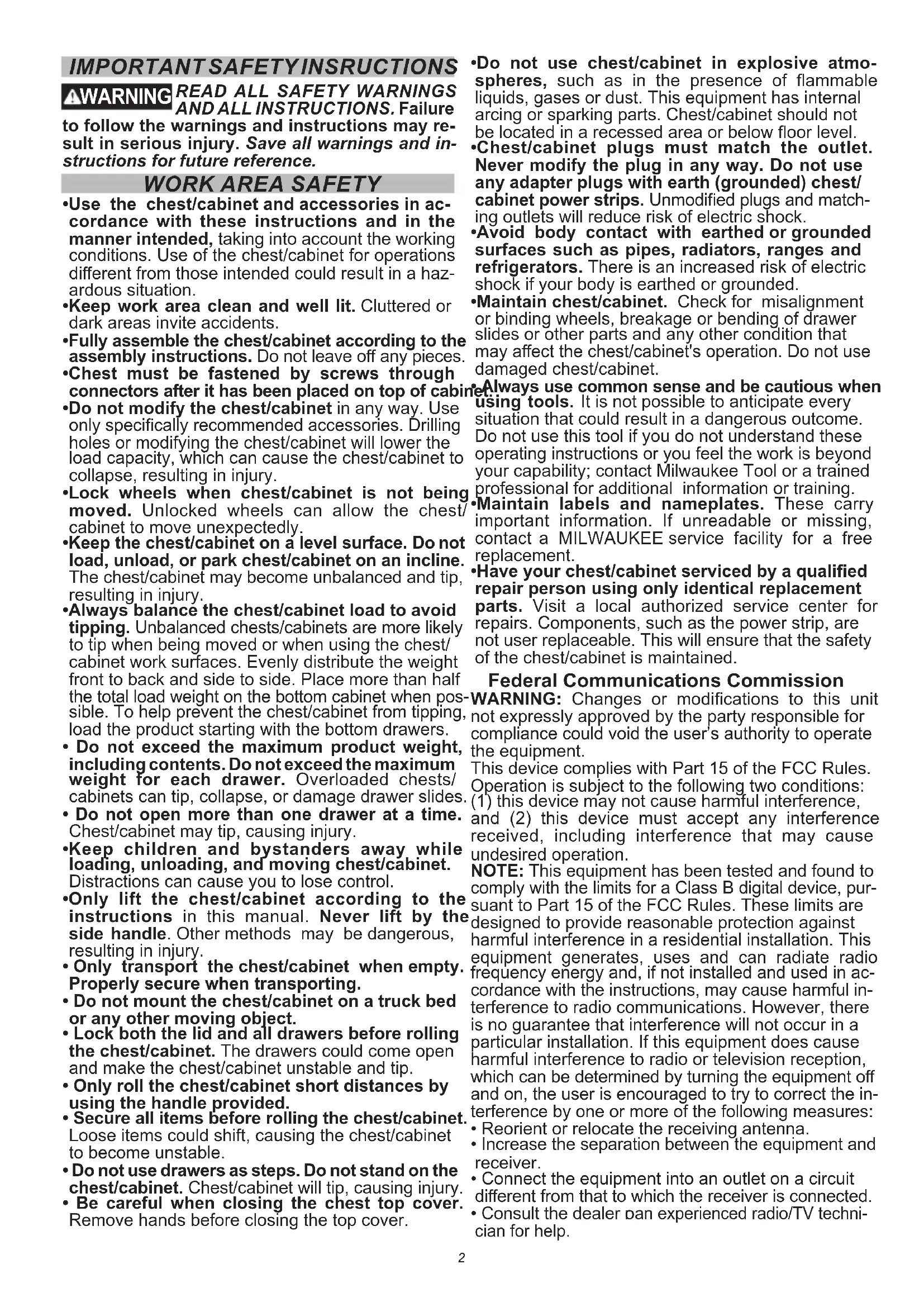Monday-Friday, 7:00 AM - 4:30 PM CST or visit www.milwaukeetool.ca LIMITED WARRANTY USA & CANADA Every MILWAUKEE steel storage chest and cabinet are warranted to the original purchaser only to be free from defects in material and workmanship. Subject to certain exceptions, MILWAUKEE will repair or replace any part on a chest or cabinet which, after examination, is determined by MILWAUKEE to be defective in material or workman- ship for a period of three (3) years after the date of purchase. Return of the chest or cabinet to the place of purchase is required. A copy of the proof of purchase should be included with the return product. This warranty does not apply to damage that MILWAUKEE determines to be from repairs made or attempted by anyone other than MILWAUKEE authorized personnel, misuse, alterations, abuse, normal wear and tear, lack of maintenance, or accidents. Warranty Registration is not necessary to obtain the applicable warran- ty on a MILWAUKEE steel storage chest or cabinet. The manufacturing date of the product will be used to determine the warranty period if no proof of purchase is provided at the time warranty service is requested. If you feel your product has a warranty defect, or if you need information on a service/replacement part, please contact MILWAUKEE at 1.800. SAWDUST for instructions. ACCEPTANCE OF THE EXCLUSIVE REPAIR AND REPLACEMENT REMEDIES DESCRIBED HEREIN IS A CONDITION OF THE CON- TRACT FOR THE PURCHASE OF EVERY MILWAUKEE PRODUCT. IF YOU DO NOT AGREE TO THIS CONDITION, YOU SHOULD NOT PURCHASE THE PRODUCT. IN NO EVENT SHALL MILWAUKEE BE LIABLE FOR ANY INCIDENTAL, SPECIAL, CONSEQUENTIAL OR PUNITIVE DAMAGES, OR FOR ANY COSTS, ATTORNEY FEES, EXPENSES, LOSSES OR DELAYS ALLEGED TO BE AS A CON- SEQUENCE OF ANY DAMAGE TO, FAILURE OF, OR DEFECT IN ANY PRODUCT INCLUDING, BUT NOT LIMITED TO, ANY CLAIMS FOR LOSS OF PROFITS. SOME STATES DO NOT ALLOW THE EX- CLUSION OR LIMITATION OF INCIDENTAL OR CONSEQUENTIAL DAMAGES, SO THE ABOVE LIMITATION OR EXCLUSION MAY NOT APPLY TO YOU. THIS WARRANTY IS EXCLUSIVE AND IN LIEU OF ALL OTHER EXPRESS WARRANTIES, WRITTEN OR ORAL. TO THE EXTENT PERMITTED BY LAW, MILWAUKEE DISCLAIMS