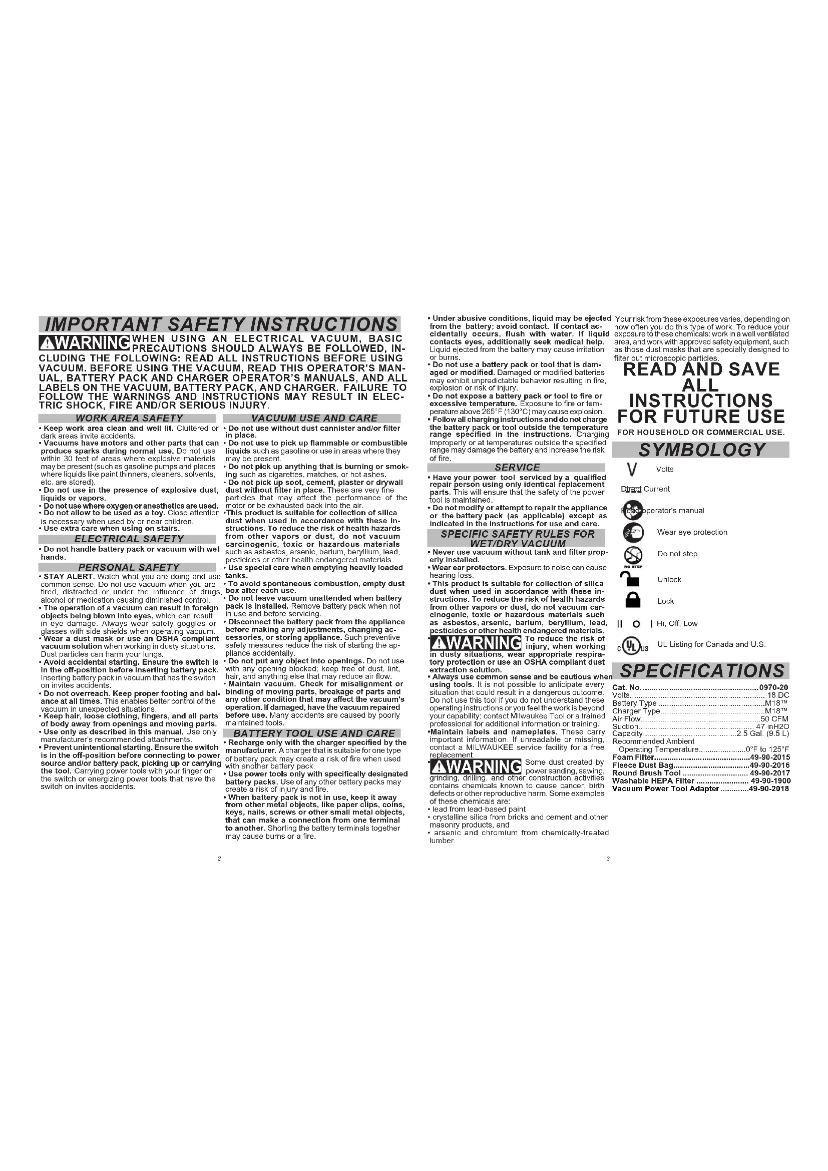 Download the instructions for your Vacuum Cleaner in PDF format for free! Find your manual 097020 - MILWAUKEE and take your electronic device back in hand. On this page are published all the documents necessary for the use of your device. 097020 by MILWAUKEE.