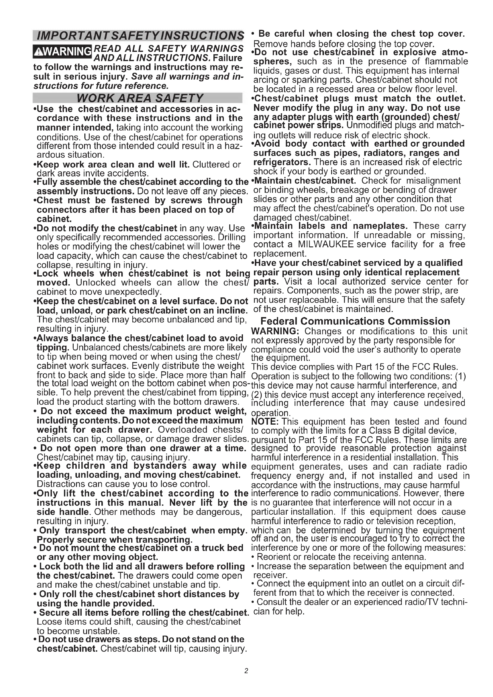 - Have your chest/cabinet serviced by a qualied repair person using only identical replacement parts. Visit a local authorized service center for repairs. Components, such as the power strip, are not user replaceable. This will ensure that the safety of the chest/cabinet is maintained. Federal Communications Commission