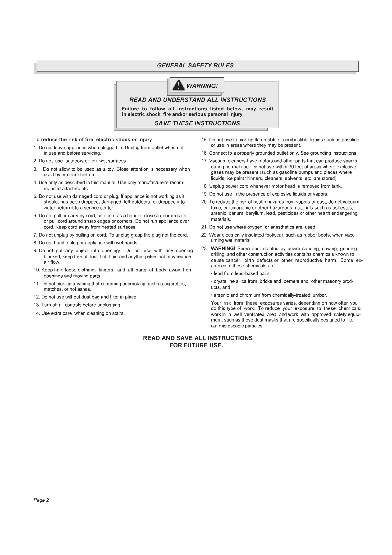 Do not store vacuum cleaner with liquid in tank. Run the vacuum for about 10 minutes without picking up anything to dry the inside of the tank and the filter cartridge. Using the vacuum as a blower (Cat. Nos. 8950 & 8955 only) Attach hose to exhaust port on the motor head, attach the appropriate accessory to the hose, turn the vacuum on. Using the vacuum cleaner to collect dust created by tools Many tools (such as sanders) are designed so that they can be used with vacuum cleaners. The vacuum cleaners collect the dust that these tools create before it gets into the air or onto the floor. Vacuum cleaners with the AUTO setting are ideal for collecting dust because they can be set up to turn on and off automatically by using the tool's on and off switch. Vacuum cleaners without an AUTO setting can also be used to collect dust. The operator will simply have to turn the vacuum on and off. Using the vacuums (without the automatic switch) as dust collection device for a tool