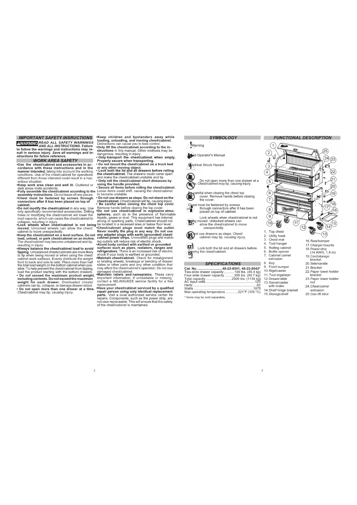 Cat.No. 48-22-8541,48-22-8542* Two-slide drawer capacity.. 100 lbs. (45.4~kg) Four-slide drawer capacity.. 200 lbs. (90.7kg) Total capacity.. 2500 lbs. (1134kg) AC input volts .. 120 Hertz .60 Watts .1875 Max operating temperature.. 221^ (105^)