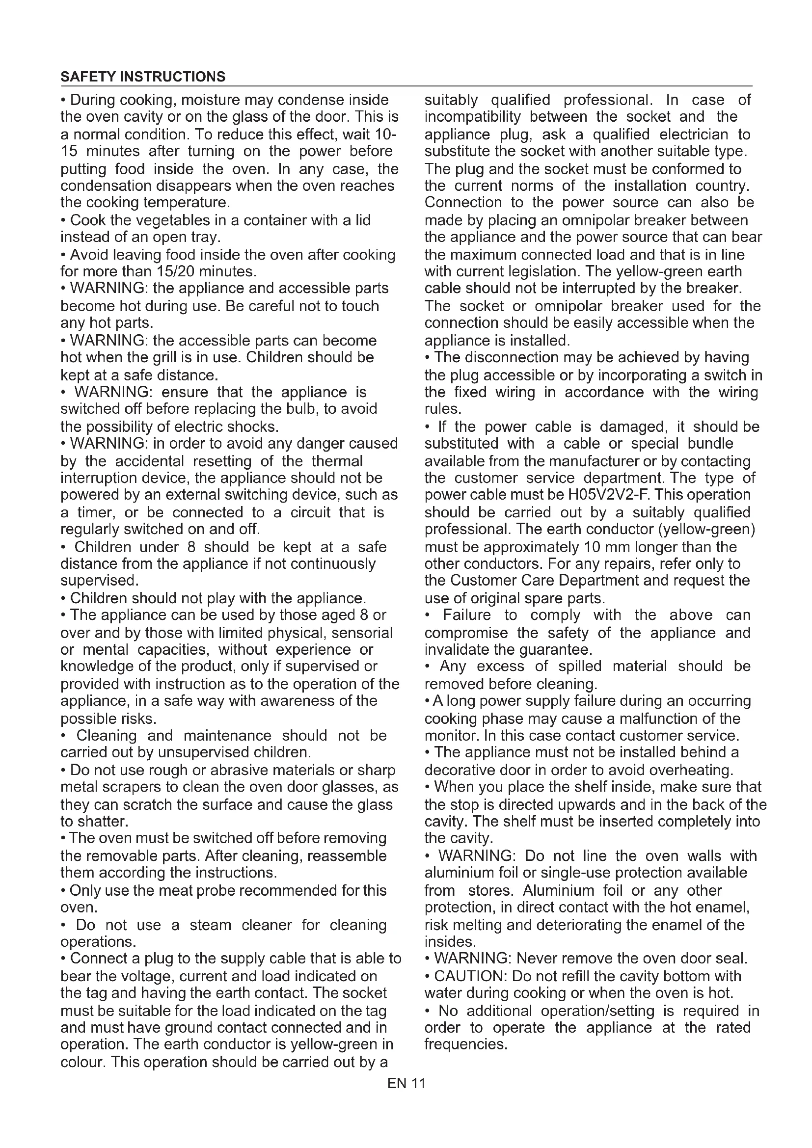 - If the cable is at all damaged it must be replaced promptly. When replacing the cable, follow these instructions. Remove the power cable and replace it with one of the H05V2V2-F type. The cable must be able to bear the electrical current required by the oven. Cable replacement must be carried out by properly qualified technicians. The earthing cable (yellow-green) must be 10 mm longer than the power cable. Use only an approved service centre for repairs and ensure that only original parts are used. If the above instructions are not adhered to the manufacturers cannot guarantee the safety of the oven.